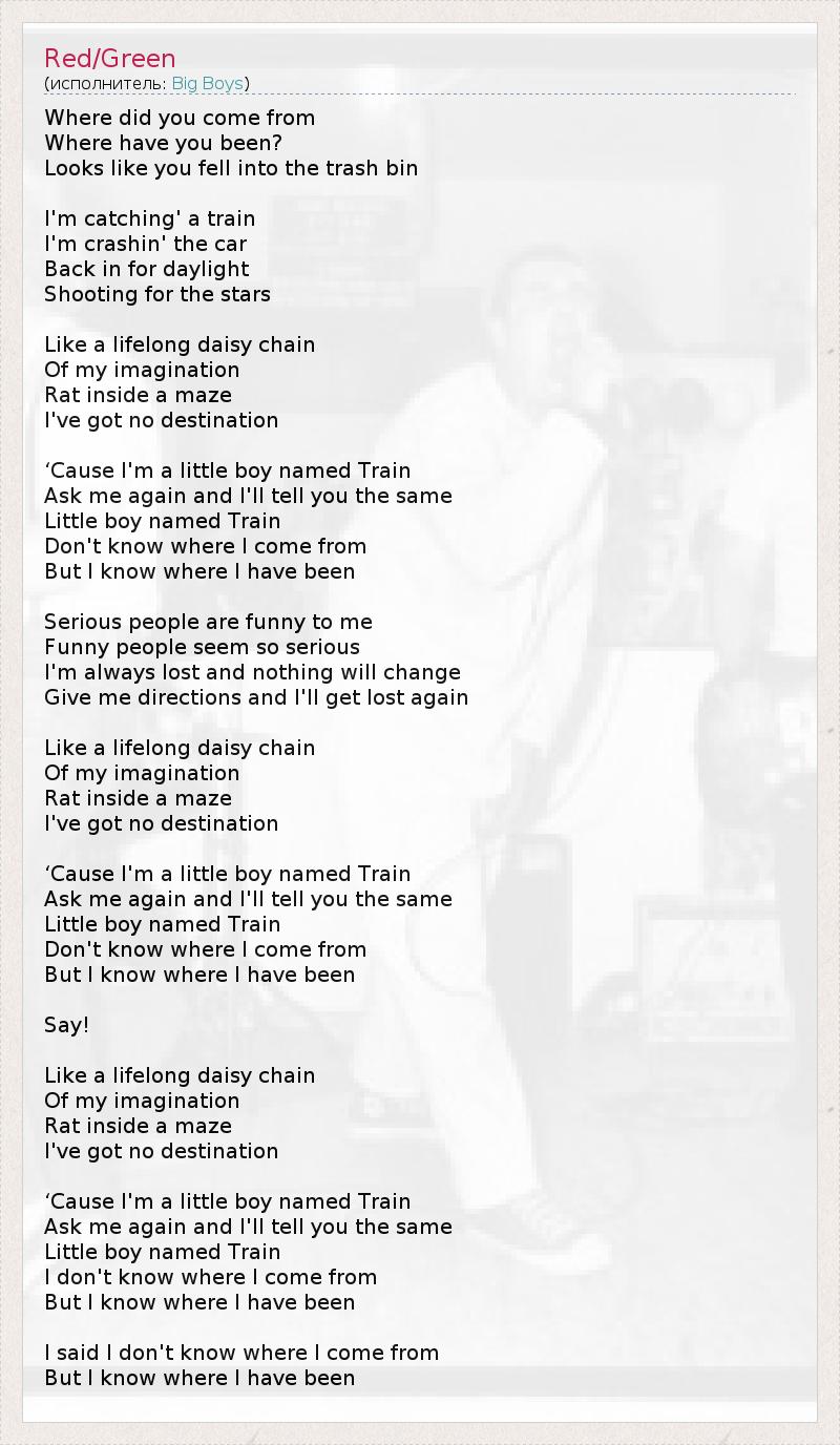 Where did you come from Where have you been? Looks like you fell into the trash bin I'm catching' a train I'm crashin' the car Back in for daylight Shooting for the stars Like a lifelong daisy chain Of my imagination Rat inside a maze I've got no destination ‘Cause I'm a little boy named Train Ask me again and I'll tell you the same Little boy named Train Don't know where I come from But I know where I have been Serious people are funny to me Funny people seem so serious I'm always lost and nothing will change Give me directions and I'll get lost again Like a lifelong daisy chain Of my imagination Rat inside a maze I've got no destination ‘Cause I'm a little boy named Train Ask me again and I'll tell you the same Little boy named Train Don't know where I come from But I know where I have been Say! Like a lifelong daisy chain Of my imagination Rat inside a maze I've got no destination ‘Cause I'm a little boy named Train Ask me again and I'll tell you the same Little boy named Train I don't know where I come from But I know where I have been I said I don't know where I come from But I know where I have been