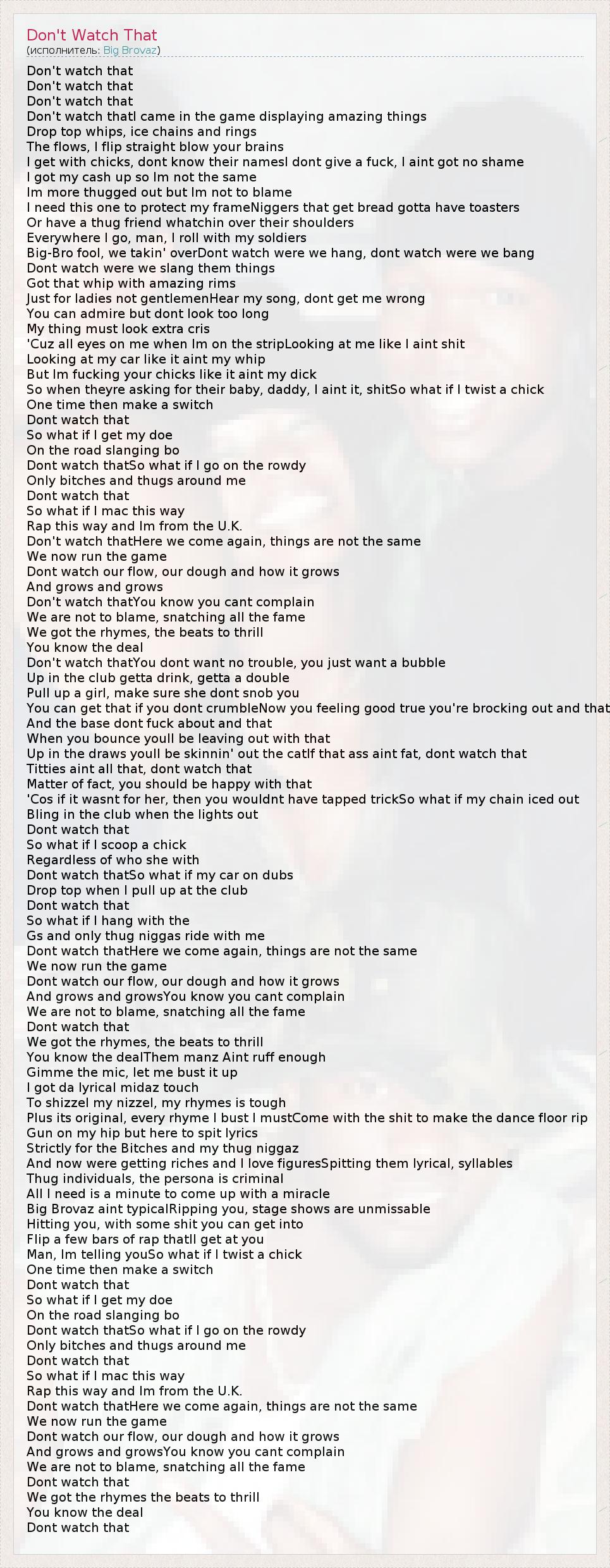 Don't watch that Don't watch that Don't watch that Don't watch thatI came in the game displaying amazing things Drop top whips, ice chains and rings The flows, I flip straight blow your brains I get with chicks, dont know their namesI dont give a fuck, I aint got no shame I got my cash up so Im not the same Im more thugged out but Im not to blame I need this one to protect my frameNiggers that get bread gotta have toasters Or have a thug friend whatchin over their shoulders Everywhere I go, man, I roll with my soldiers Big-Bro fool, we takin' overDont watch were we hang, dont watch were we bang Dont watch were we slang them things Got that whip with amazing rims Just for ladies not gentlemenHear my song, dont get me wrong You can admire but dont look too long My thing must look extra cris 'Cuz all eyes on me when Im on the stripLooking at me like I aint shit Looking at my car like it aint my whip But Im fucking your chicks like it aint my dick So when theyre asking for their baby, daddy, I aint it, shitSo what if I twist a chick One time then make a switch Dont watch that So what if I get my doe On the road slanging bo Dont watch thatSo what if I go on the rowdy Only bitches and thugs around me Dont watch that So what if I mac this way Rap this way and Im from the U.K. Don't watch thatHere we come again, things are not the same We now run the game Dont watch our flow, our dough and how it grows And grows and grows Don't watch thatYou know you cant complain We are not to blame, snatching all the fame We got the rhymes, the beats to thrill You know the deal Don't watch thatYou dont want no trouble, you just want a bubble Up in the club getta drink, getta a double Pull up a girl, make sure she dont snob you You can get that if you dont crumbleNow you feeling good true you're brocking out and that And the base dont fuck about and that When you bounce youll be leaving out with that Up in the draws youll be skinnin' out the catIf that ass aint fat, dont watch that Titties aint all that, dont watch that Matter of fact, you should be happy with that 'Cos if it wasnt for her, then you wouldnt have tapped trickSo what if my chain iced out Bling in the club when the lights out Dont watch that So what if I scoop a chick Regardless of who she with Dont watch thatSo what if my car on dubs Drop top when I pull up at the club Dont watch that So what if I hang with the Gs and only thug niggas ride with me Dont watch thatHere we come again, things are not the same We now run the game Dont watch our flow, our dough and how it grows And grows and growsYou know you cant complain We are not to blame, snatching all the fame Dont watch that We got the rhymes, the beats to thrill You know the dealThem manz Aint ruff enough Gimme the mic, let me bust it up I got da lyrical midaz touch To shizzel my nizzel, my rhymes is tough Plus its original, every rhyme I bust I mustCome with the shit to make the dance floor rip Gun on my hip but here to spit lyrics Strictly for the Bitches and my thug niggaz And now were getting riches and I love figuresSpitting them lyrical, syllables Thug individuals, the persona is criminal All I need is a minute to come up with a miracle Big Brovaz aint typicalRipping you, stage shows are unmissable Hitting you, with some shit you can get into Flip a few bars of rap thatll get at you Man, Im telling youSo what if I twist a chick One time then make a switch Dont watch that So what if I get my doe On the road slanging bo Dont watch thatSo what if I go on the rowdy Only bitches and thugs around me Dont watch that So what if I mac this way Rap this way and Im from the U.K. Dont watch thatHere we come again, things are not the same We now run the game Dont watch our flow, our dough and how it grows And grows and growsYou know you cant complain We are not to blame, snatching all the fame Dont watch that We got the rhymes the beats to thrill You know the deal Dont watch that