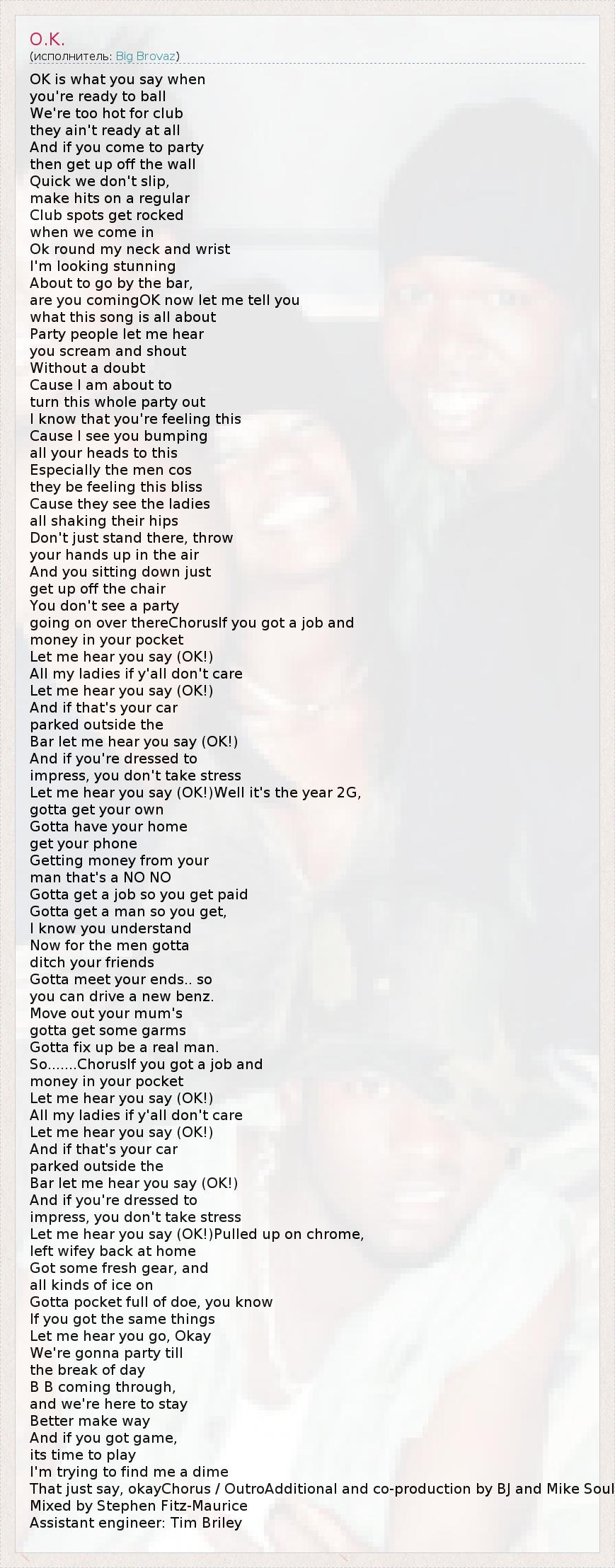 OK is what you say when you're ready to ball We're too hot for club they ain't ready at all And if you come to party then get up off the wall Quick we don't slip, make hits on a regular Club spots get rocked when we come in Ok round my neck and wrist I'm looking stunning About to go by the bar, are you comingOK now let me tell you what this song is all about Party people let me hear you scream and shout Without a doubt Cause I am about to turn this whole party out I know that you're feeling this Cause I see you bumping all your heads to this Especially the men cos they be feeling this bliss Cause they see the ladies all shaking their hips Don't just stand there, throw your hands up in the air And you sitting down just get up off the chair You don't see a party going on over thereChorusIf you got a job and money in your pocket Let me hear you say (OK!) All my ladies if y'all don't care Let me hear you say (OK!) And if that's your car parked outside the Bar let me hear you say (OK!) And if you're dressed to impress, you don't take stress Let me hear you say (OK!)Well it's the year 2G, gotta get your own Gotta have your home get your phone Getting money from your man that's a NO NO Gotta get a job so you get paid Gotta get a man so you get, I know you understand Now for the men gotta ditch your friends Gotta meet your ends.. so you can drive a new benz. Move out your mum's gotta get some garms Gotta fix up be a real man. So.......ChorusIf you got a job and money in your pocket Let me hear you say (OK!) All my ladies if y'all don't care Let me hear you say (OK!) And if that's your car parked outside the Bar let me hear you say (OK!) And if you're dressed to impress, you don't take stress Let me hear you say (OK!)Pulled up on chrome, left wifey back at home Got some fresh gear, and all kinds of ice on Gotta pocket full of doe, you know If you got the same things Let me hear you go, Okay We're gonna party till the break of day B B coming through, and we're here to stay Better make way And if you got game, its time to play I'm trying to find me a dime That just say, okayChorus / OutroAdditional and co-production by BJ and Mike Soul Mixed by Stephen Fitz-Maurice Assistant engineer: Tim Briley