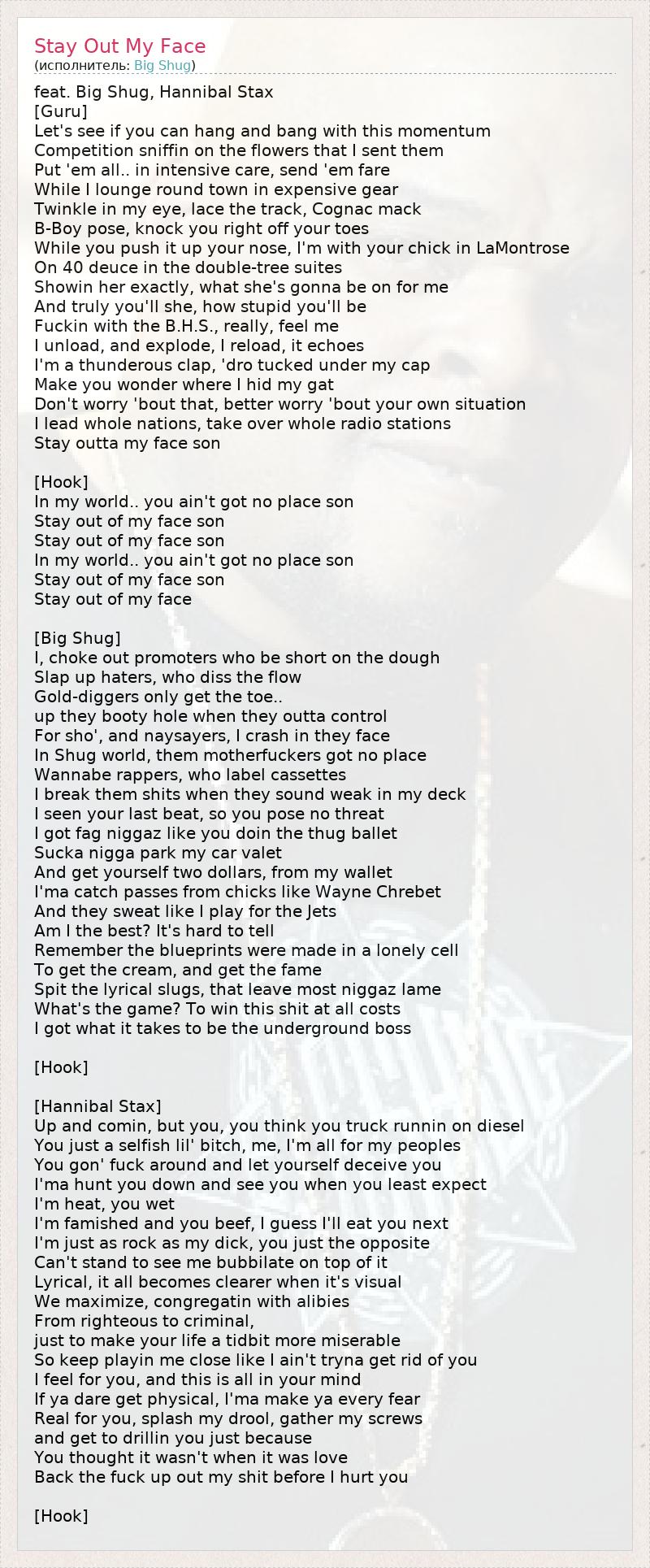 feat. Big Shug, Hannibal Stax [Guru] Let's see if you can hang and bang with this momentum Competition sniffin on the flowers that I sent them Put 'em all.. in intensive care, send 'em fare While I lounge round town in expensive gear Twinkle in my eye, lace the track, Cognac mack B-Boy pose, knock you right off your toes While you push it up your nose, I'm with your chick in LaMontrose On 40 deuce in the double-tree suites Showin her exactly, what she's gonna be on for me And truly you'll she, how stupid you'll be Fuckin with the B.H.S., really, feel me I unload, and explode, I reload, it echoes I'm a thunderous clap, 'dro tucked under my cap Make you wonder where I hid my gat Don't worry 'bout that, better worry 'bout your own situation I lead whole nations, take over whole radio stations Stay outta my face son [Hook] In my world.. you ain't got no place son Stay out of my face son Stay out of my face son In my world.. you ain't got no place son Stay out of my face son Stay out of my face [Big Shug] I, choke out promoters who be short on the dough Slap up haters, who diss the flow Gold-diggers only get the toe.. up they booty hole when they outta control For sho', and naysayers, I crash in they face In Shug world, them motherfuckers got no place Wannabe rappers, who label cassettes I break them shits when they sound weak in my deck I seen your last beat, so you pose no threat I got fag niggaz like you doin the thug ballet Sucka nigga park my car valet And get yourself two dollars, from my wallet I'ma catch passes from chicks like Wayne Chrebet And they sweat like I play for the Jets Am I the best? It's hard to tell Remember the blueprints were made in a lonely cell To get the cream, and get the fame Spit the lyrical slugs, that leave most niggaz lame What's the game? To win this shit at all costs I got what it takes to be the underground boss [Hook] [Hannibal Stax] Up and comin, but you, you think you truck runnin on diesel You just a selfish lil' bitch, me, I'm all for my peoples You gon' fuck around and let yourself deceive you I'ma hunt you down and see you when you least expect I'm heat, you wet I'm famished and you beef, I guess I'll eat you next I'm just as rock as my dick, you just the opposite Can't stand to see me bubbilate on top of it Lyrical, it all becomes clearer when it's visual We maximize, congregatin with alibies From righteous to criminal, just to make your life a tidbit more miserable So keep playin me close like I ain't tryna get rid of you I feel for you, and this is all in your mind If ya dare get physical, I'ma make ya every fear Real for you, splash my drool, gather my screws and get to drillin you just because You thought it wasn't when it was love Back the fuck up out my shit before I hurt you [Hook]