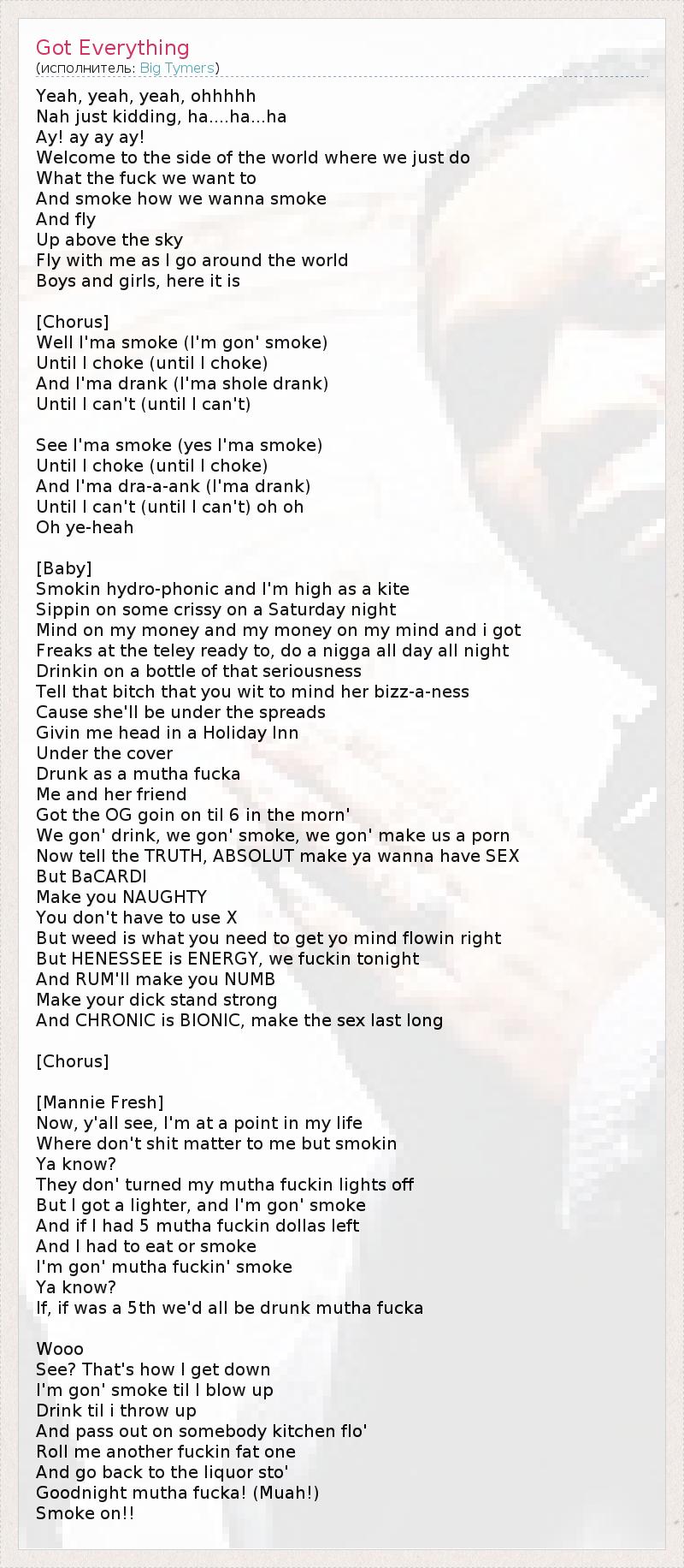 Yeah, yeah, yeah, ohhhhh Nah just kidding, ha....ha...ha Ay! ay ay ay! Welcome to the side of the world where we just do What the fuck we want to And smoke how we wanna smoke And fly Up above the sky Fly with me as I go around the world Boys and girls, here it is [Chorus] Well I'ma smoke (I'm gon' smoke) Until I choke (until I choke) And I'ma drank (I'ma shole drank) Until I can't (until I can't) See I'ma smoke (yes I'ma smoke) Until I choke (until I choke) And I'ma dra-a-ank (I'ma drank) Until I can't (until I can't) oh oh Oh ye-heah [Baby] Smokin hydro-phonic and I'm high as a kite Sippin on some crissy on a Saturday night Mind on my money and my money on my mind and i got Freaks at the teley ready to, do a nigga all day all night Drinkin on a bottle of that seriousness Tell that bitch that you wit to mind her bizz-a-ness Cause she'll be under the spreads Givin me head in a Holiday Inn Under the cover Drunk as a mutha fucka Me and her friend Got the OG goin on til 6 in the morn' We gon' drink, we gon' smoke, we gon' make us a porn Now tell the TRUTH, ABSOLUT make ya wanna have SEX But BaCARDI Make you NAUGHTY You don't have to use X But weed is what you need to get yo mind flowin right But HENESSEE is ENERGY, we fuckin tonight And RUM'll make you NUMB Make your dick stand strong And CHRONIC is BIONIC, make the sex last long [Chorus] [Mannie Fresh] Now, y'all see, I'm at a point in my life Where don't shit matter to me but smokin Ya know? They don' turned my mutha fuckin lights off But I got a lighter, and I'm gon' smoke And if I had 5 mutha fuckin dollas left And I had to eat or smoke I'm gon' mutha fuckin' smoke Ya know? If, if was a 5th we'd all be drunk mutha fucka Wooo See? That's how I get down I'm gon' smoke til I blow up Drink til i throw up And pass out on somebody kitchen flo' Roll me another fuckin fat one And go back to the liquor sto' Goodnight mutha fucka! (Muah!) Smoke on!!