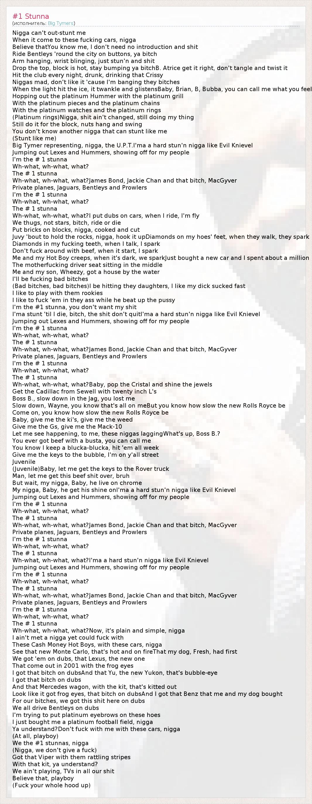 Nigga can't out-stunt me When it come to these fucking cars, nigga Believe thatYou know me, I don't need no introduction and shit Ride Bentleys 'round the city on buttons, ya bitch Arm hanging, wrist blinging, just stun'n and shit Drop the top, block is hot, stay bumping ya bitchB. Atrice get it right, don't tangle and twist it Hit the club every night, drunk, drinking that Crissy Niggas mad, don't like it 'cause I'm banging they bitches When the light hit the ice, it twankle and glistensBaby, Brian, B, Bubba, you can call me what you feel Hopping out the platinum Hummer with the platinum grill With the platinum pieces and the platinum chains With the platinum watches and the platinum rings (Platinum rings)Nigga, shit ain't changed, still doing my thing Still do it for the block, nuts hang and swing You don't know another nigga that can stunt like me (Stunt like me) Big Tymer representing, nigga, the U.P.T.I'ma a hard stun'n nigga like Evil Knievel Jumping out Lexes and Hummers, showing off for my people I'm the # 1 stunna Wh-what, wh-what, what? The # 1 stunna Wh-what, wh-what, what?James Bond, Jackie Chan and that bitch, MacGyver Private planes, Jaguars, Bentleys and Prowlers I'm the # 1 stunna Wh-what, wh-what, what? The # 1 stunna Wh-what, wh-what, what?I put dubs on cars, when I ride, I'm fly We thugs, not stars, bitch, ride or die Put bricks on blocks, nigga, cooked and cut Juvy 'bout to hold the rocks, nigga, hook it upDiamonds on my hoes' feet, when they walk, they spark Diamonds in my fucking teeth, when I talk, I spark Don't fuck around with beef, when it start, I spark Me and my Hot Boy creeps, when it's dark, we sparkJust bought a new car and I spent about a million The motherfucking driver seat sitting in the middle Me and my son, Wheezy, got a house by the water I'll be fucking bad bitches (Bad bitches, bad bitches)I be hitting they daughters, I like my dick sucked fast I like to play with them rookies I like to fuck 'em in they ass while he beat up the pussy I'm the #1 stunna, you don't want my shit I'ma stunt 'til I die, bitch, the shit don't quitI'ma a hard stun'n nigga like Evil Knievel Jumping out Lexes and Hummers, showing off for my people I'm the # 1 stunna Wh-what, wh-what, what? The # 1 stunna Wh-what, wh-what, what?James Bond, Jackie Chan and that bitch, MacGyver Private planes, Jaguars, Bentleys and Prowlers I'm the # 1 stunna Wh-what, wh-what, what? The # 1 stunna Wh-what, wh-what, what?Baby, pop the Cristal and shine the jewels Get the Cadillac from Sewell with twenty inch L's Boss B., slow down in the Jag, you lost me Slow down, Wayne, you know that's all on meBut you know how slow the new Rolls Royce be Come on, you know how slow the new Rolls Royce be Baby, give me the ki's, give me the weed Give me the Gs, give me the Mack-10 Let me see happening, to me, these niggas laggingWhat's up, Boss B.? You ever got beef with a busta, you can call me You know I keep a blucka-blucka, hit 'em all week Give me the keys to the bubble, I'm on y'all street Juvenile (Juvenile)Baby, let me get the keys to the Rover truck Man, let me get this beef shit over, bruh But wait, my nigga, Baby, he live on chrome My nigga, Baby, he get his shine onI'ma a hard stun'n nigga like Evil Knievel Jumping out Lexes and Hummers, showing off for my people I'm the # 1 stunna Wh-what, wh-what, what? The # 1 stunna Wh-what, wh-what, what?James Bond, Jackie Chan and that bitch, MacGyver Private planes, Jaguars, Bentleys and Prowlers I'm the # 1 stunna Wh-what, wh-what, what? The # 1 stunna Wh-what, wh-what, what?I'ma a hard stun'n nigga like Evil Knievel Jumping out Lexes and Hummers, showing off for my people I'm the # 1 stunna Wh-what, wh-what, what? The # 1 stunna Wh-what, wh-what, what?James Bond, Jackie Chan and that bitch, MacGyver Private planes, Jaguars, Bentleys and Prowlers I'm the # 1 stunna Wh-what, wh-what, what? The # 1 stunna Wh-what, wh-what, what?Now, it's plain and simple, nigga I ain't met a nigga yet could fuck with These Cash Money Hot Boys, with these cars, nigga See that new Monte Carlo, that's hot and on fireThat my dog, Fresh, had first We got 'em on dubs, that Lexus, the new one That come out in 2001 with the frog eyes I got that bitch on dubsAnd that Yu, the new Yukon, that's bubble-eye I got that bitch on dubs And that Mercedes wagon, with the kit, that's kitted out Look like it got frog eyes, that bitch on dubsAnd I got that Benz that me and my dog bought For our bitches, we got this shit here on dubs We all drive Bentleys on dubs I'm trying to put platinum eyebrows on these hoes I just bought me a platinum football field, nigga Ya understand?Don't fuck with me with these cars, nigga (At all, playboy) We the #1 stunnas, nigga (Nigga, we don't give a fuck) Got that Viper with them rattling stripes With that kit, ya understand? We ain't playing, TVs in all our shit Believe that, playboy (Fuck your whole hood up)