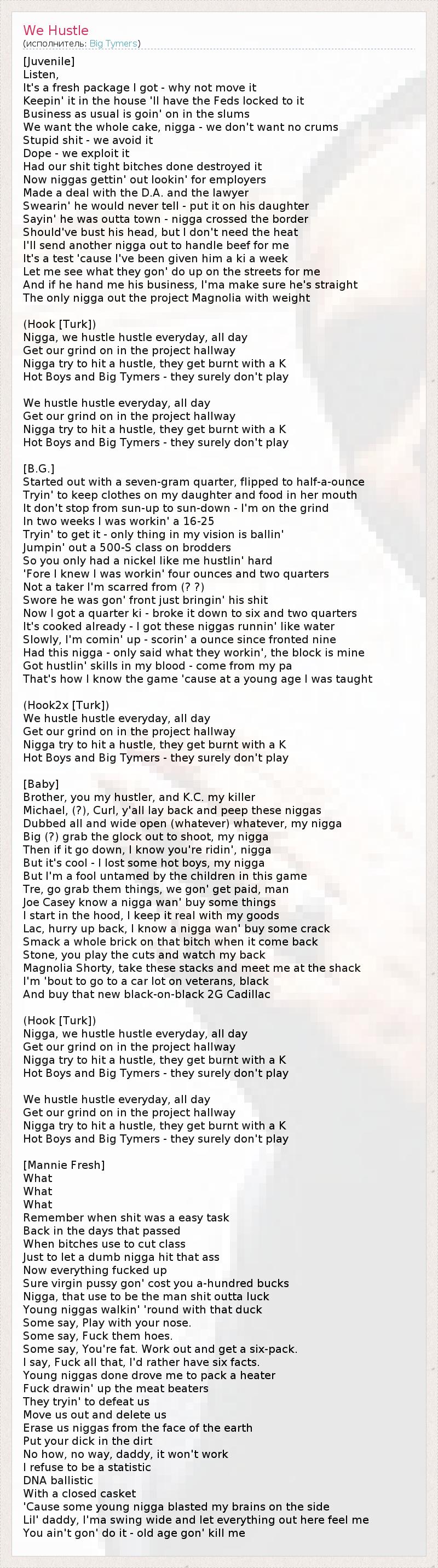 [Juvenile] Listen, It's a fresh package I got - why not move it Keepin' it in the house 'll have the Feds locked to it Business as usual is goin' on in the slums We want the whole cake, nigga - we don't want no crums Stupid shit - we avoid it Dope - we exploit it Had our shit tight bitches done destroyed it Now niggas gettin' out lookin' for employers Made a deal with the D.A. and the lawyer Swearin' he would never tell - put it on his daughter Sayin' he was outta town - nigga crossed the border Should've bust his head, but I don't need the heat I'll send another nigga out to handle beef for me It's a test 'cause I've been given him a ki a week Let me see what they gon' do up on the streets for me And if he hand me his business, I'ma make sure he's straight The only nigga out the project Magnolia with weight (Hook [Turk]) Nigga, we hustle hustle everyday, all day Get our grind on in the project hallway Nigga try to hit a hustle, they get burnt with a K Hot Boys and Big Tymers - they surely don't play We hustle hustle everyday, all day Get our grind on in the project hallway Nigga try to hit a hustle, they get burnt with a K Hot Boys and Big Tymers - they surely don't play [B.G.] Started out with a seven-gram quarter, flipped to half-a-ounce Tryin' to keep clothes on my daughter and food in her mouth It don't stop from sun-up to sun-down - I'm on the grind In two weeks I was workin' a 16-25 Tryin' to get it - only thing in my vision is ballin' Jumpin' out a 500-S class on brodders So you only had a nickel like me hustlin' hard 'Fore I knew I was workin' four ounces and two quarters Not a taker I'm scarred from (? ?) Swore he was gon' front just bringin' his shit Now I got a quarter ki - broke it down to six and two quarters It's cooked already - I got these niggas runnin' like water Slowly, I'm comin' up - scorin' a ounce since fronted nine Had this nigga - only said what they workin', the block is mine Got hustlin' skills in my blood - come from my pa That's how I know the game 'cause at a young age I was taught (Hook2x [Turk]) We hustle hustle everyday, all day Get our grind on in the project hallway Nigga try to hit a hustle, they get burnt with a K Hot Boys and Big Tymers - they surely don't play [Baby] Brother, you my hustler, and K.C. my killer Michael, (?), Curl, y'all lay back and peep these niggas Dubbed all and wide open (whatever) whatever, my nigga Big (?) grab the glock out to shoot, my nigga Then if it go down, I know you're ridin', nigga But it's cool - I lost some hot boys, my nigga But I'm a fool untamed by the children in this game Tre, go grab them things, we gon' get paid, man Joe Casey know a nigga wan' buy some things I start in the hood, I keep it real with my goods Lac, hurry up back, I know a nigga wan' buy some crack Smack a whole brick on that bitch when it come back Stone, you play the cuts and watch my back Magnolia Shorty, take these stacks and meet me at the shack I'm 'bout to go to a car lot on veterans, black And buy that new black-on-black 2G Cadillac (Hook [Turk]) Nigga, we hustle hustle everyday, all day Get our grind on in the project hallway Nigga try to hit a hustle, they get burnt with a K Hot Boys and Big Tymers - they surely don't play We hustle hustle everyday, all day Get our grind on in the project hallway Nigga try to hit a hustle, they get burnt with a K Hot Boys and Big Tymers - they surely don't play [Mannie Fresh] What What What Remember when shit was a easy task Back in the days that passed When bitches use to cut class Just to let a dumb nigga hit that ass Now everything fucked up Sure virgin pussy gon' cost you a-hundred bucks Nigga, that use to be the man shit outta luck Young niggas walkin' 'round with that duck Some say, Play with your nose. Some say, Fuck them hoes. Some say, You're fat. Work out and get a six-pack. I say, Fuck all that, I'd rather have six facts. Young niggas done drove me to pack a heater Fuck drawin' up the meat beaters They tryin' to defeat us Move us out and delete us Erase us niggas from the face of the earth Put your dick in the dirt No how, no way, daddy, it won't work I refuse to be a statistic DNA ballistic With a closed casket 'Cause some young nigga blasted my brains on the side Lil' daddy, I'ma swing wide and let everything out here feel me You ain't gon' do it - old age gon' kill me