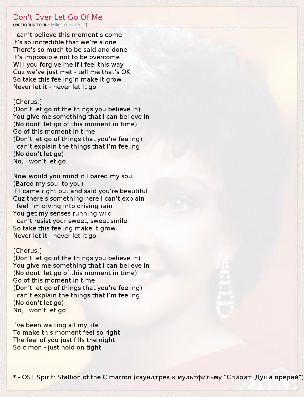 I can't believe this moment's come It's so incredible that we're alone There's so much to be said and done It's impossible not to be overcome Will you forgive me if I feel this way Cuz we've just met - tell me that's OK So take this feeling'n make it grow Never let it - never let it go [Chorus:] (Don't let go of the things you believe in) You give me something that I can believe in (No dont' let go of this moment in time) Go of this moment in time (Don't let go of things that you're feeling) I can't explain the things that I'm feeling (No don't let go) No, I won't let go Now would you mind if I bared my soul (Bared my soul to you) If I came right out and said you're beautiful Cuz there's something here I can't explain I feel I'm diving into driving rain You get my senses running wild I can't resist your sweet, sweet smile So take this feeling make it grow Never let it - never let it go [Chorus:] (Don't let go of the things you believe in) You give me something that I can believe in (No dont' let go of this moment in time) Go of this moment in time (Don't let go of things that you're feeling) I can't explain the things that I'm feeling (No don't let go) No, I won't let go I've been waiting all my life To make this moment feel so right The feel of you just fills the night So c'mon - just hold on tight * - OST Spirit: Stallion of the Cimarron (саундтрек к мультфильму "Спирит: Душа прерий")