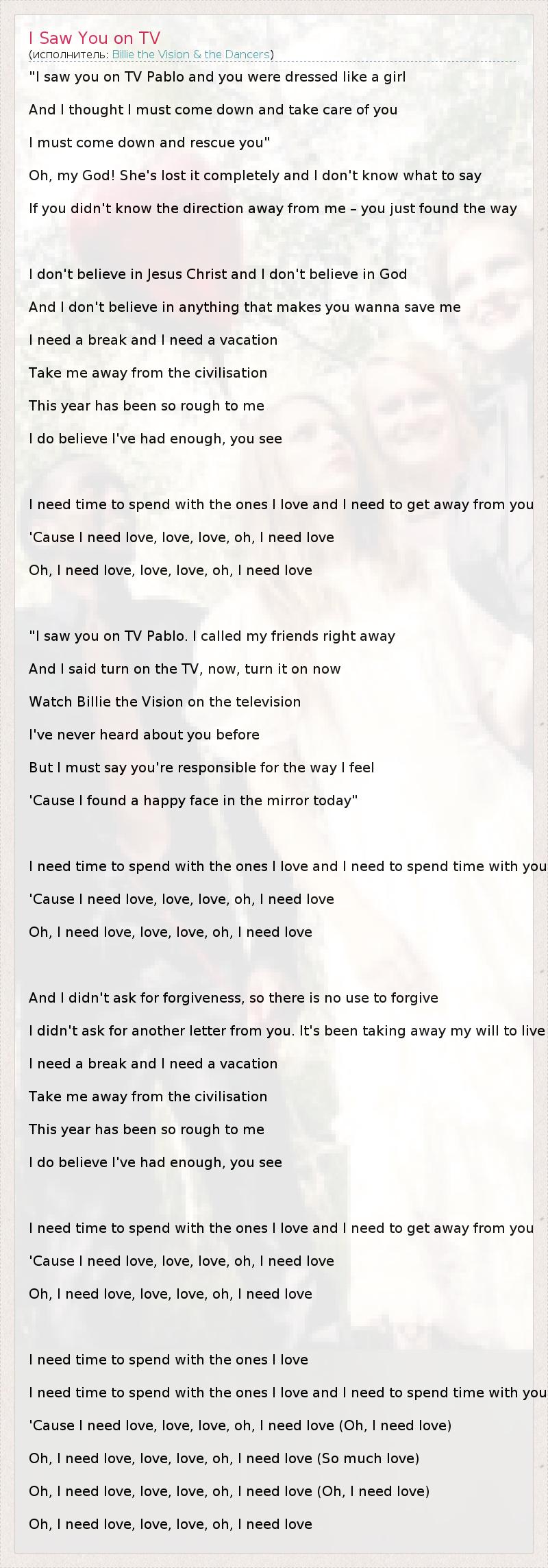 "I saw you on TV Pablo and you were dressed like a girl And I thought I must come down and take care of you I must come down and rescue you" Oh, my God! She's lost it completely and I don't know what to say If you didn't know the direction away from me – you just found the way I don't believe in Jesus Christ and I don't believe in God And I don't believe in anything that makes you wanna save me I need a break and I need a vacation Take me away from the civilisation This year has been so rough to me I do believe I've had enough, you see I need time to spend with the ones I love and I need to get away from you 'Cause I need love, love, love, oh, I need love Oh, I need love, love, love, oh, I need love "I saw you on TV Pablo. I called my friends right away And I said turn on the TV, now, turn it on now Watch Billie the Vision on the television I've never heard about you before But I must say you're responsible for the way I feel 'Cause I found a happy face in the mirror today" I need time to spend with the ones I love and I need to spend time with you 'Cause I need love, love, love, oh, I need love Oh, I need love, love, love, oh, I need love And I didn't ask for forgiveness, so there is no use to forgive I didn't ask for another letter from you. It's been taking away my will to live I need a break and I need a vacation Take me away from the civilisation This year has been so rough to me I do believe I've had enough, you see I need time to spend with the ones I love and I need to get away from you 'Cause I need love, love, love, oh, I need love Oh, I need love, love, love, oh, I need love I need time to spend with the ones I love I need time to spend with the ones I love and I need to spend time with you 'Cause I need love, love, love, oh, I need love (Oh, I need love) Oh, I need love, love, love, oh, I need love (So much love) Oh, I need love, love, love, oh, I need love (Oh, I need love) Oh, I need love, love, love, oh, I need love