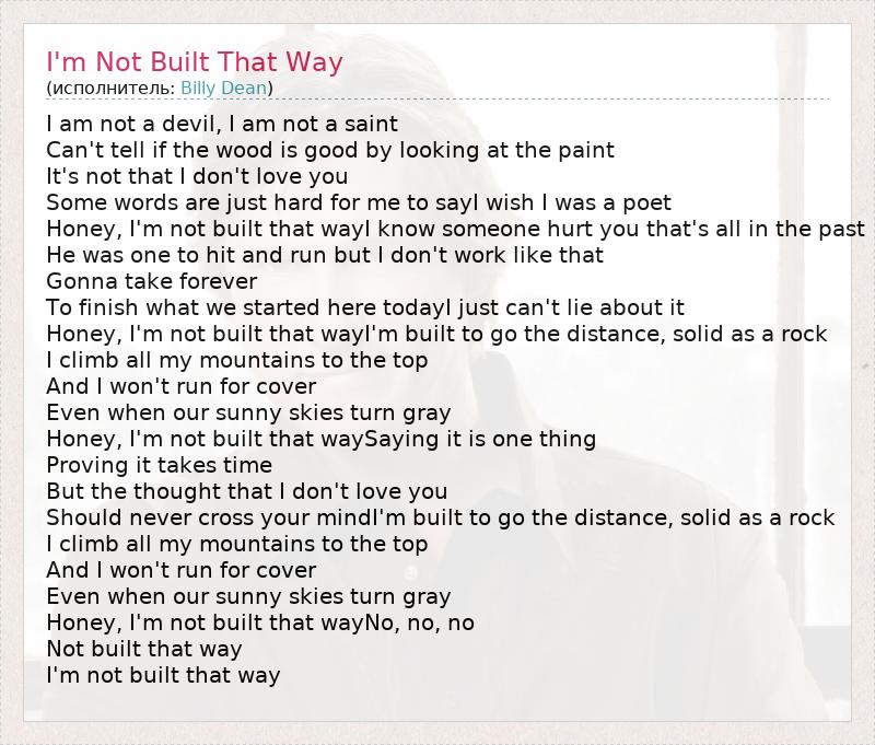 I am not a devil, I am not a saint Can't tell if the wood is good by looking at the paint It's not that I don't love you Some words are just hard for me to sayI wish I was a poet Honey, I'm not built that wayI know someone hurt you that's all in the past He was one to hit and run but I don't work like that Gonna take forever To finish what we started here todayI just can't lie about it Honey, I'm not built that wayI'm built to go the distance, solid as a rock I climb all my mountains to the top And I won't run for cover Even when our sunny skies turn gray Honey, I'm not built that waySaying it is one thing Proving it takes time But the thought that I don't love you Should never cross your mindI'm built to go the distance, solid as a rock I climb all my mountains to the top And I won't run for cover Even when our sunny skies turn gray Honey, I'm not built that wayNo, no, no Not built that way I'm not built that way
