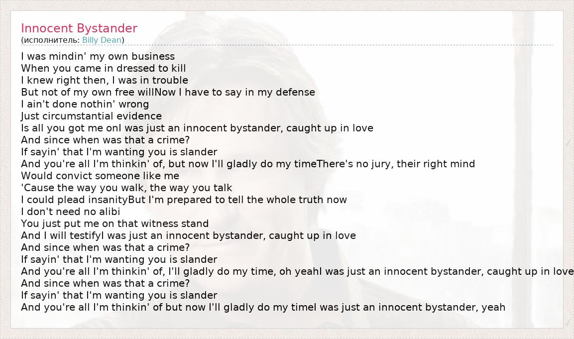 I was mindin' my own business When you came in dressed to kill I knew right then, I was in trouble But not of my own free willNow I have to say in my defense I ain't done nothin' wrong Just circumstantial evidence Is all you got me onI was just an innocent bystander, caught up in love And since when was that a crime? If sayin' that I'm wanting you is slander And you're all I'm thinkin' of, but now I'll gladly do my timeThere's no jury, their right mind Would convict someone like me 'Cause the way you walk, the way you talk I could plead insanityBut I'm prepared to tell the whole truth now I don't need no alibi You just put me on that witness stand And I will testifyI was just an innocent bystander, caught up in love And since when was that a crime? If sayin' that I'm wanting you is slander And you're all I'm thinkin' of, I'll gladly do my time, oh yeahI was just an innocent bystander, caught up in love And since when was that a crime? If sayin' that I'm wanting you is slander And you're all I'm thinkin' of but now I'll gladly do my timeI was just an innocent bystander, yeah