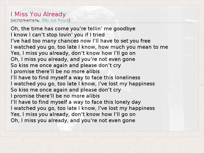 Oh, the time has come you're tellin' me goodbye I know I can't stop lovin' you if I tried I've had too many chances now I'll have to set you free I watched you go, too late I know, how much you mean to me Yes, I miss you already, don't know how I'll go on Oh, I miss you already, and you're not even gone So kiss me once again and please don't cry I promise there'll be no more alibis I'll have to find myself a way to face this loneliness I watched you go, too late I know, I've lost my happiness So kiss me once again and please don't cry I promise there'll be no more alibis I'll have to find myself a way to face this lonely day I watched you go, too late I know, I've lost my happiness Yes, I miss you already, don't know how I'll go on Oh, I miss you already, and you're not even gone