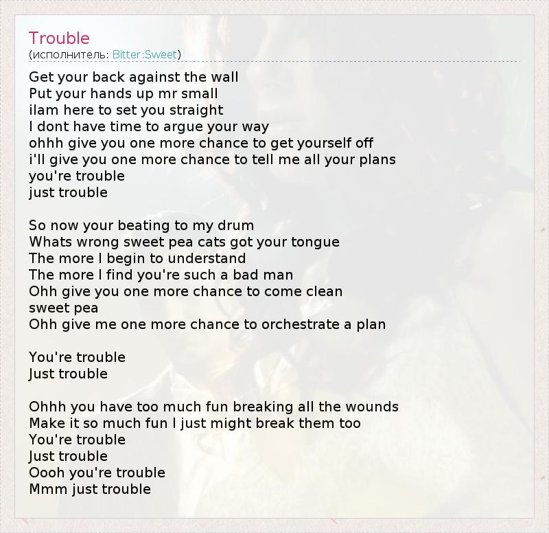 Get your back against the wall Put your hands up mr small iIam here to set you straight I dont have time to argue your way ohhh give you one more chance to get yourself off i'll give you one more chance to tell me all your plans you're trouble just trouble So now your beating to my drum Whats wrong sweet pea cats got your tongue The more I begin to understand The more I find you're such a bad man Ohh give you one more chance to come clean sweet pea Ohh give me one more chance to orchestrate a plan You're trouble Just trouble Ohhh you have too much fun breaking all the wounds Make it so much fun I just might break them too You're trouble Just trouble Oooh you're trouble Mmm just trouble