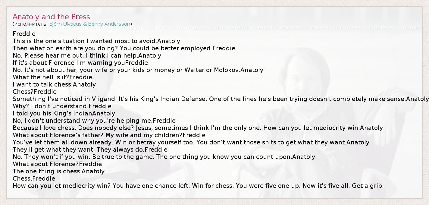 Freddie This is the one situation I wanted most to avoid.Anatoly Then what on earth are you doing? You could be better employed.Freddie No. Please hear me out. I think I can help.Anatoly If it's about Florence I'm warning youFreddie No. It's not about her, your wife or your kids or money or Walter or Molokov.Anatoly What the hell is it?Freddie I want to talk chess.Anatoly Chess?Freddie Something I've noticed in Viigand. It's his King's Indian Defense. One of the lines he's been trying doesn't completely make sense.Anatoly Why? I don't understand.Freddie I told you his King's IndianAnatoly No, I don't understand why you're helping me.Freddie Because I love chess. Does nobody else? Jesus, sometimes I think I'm the only one. How can you let mediocrity win.Anatoly What about Florence's father? My wife and my children?Freddie You've let them all down already. Win or betray yourself too. You don't want those shits to get what they want.Anatoly They'll get what they want. They always do.Freddie No. They won't if you win. Be true to the game. The one thing you know you can count upon.Anatoly What about Florence?Freddie The one thing is chess.Anatoly Chess.Freddie How can you let mediocrity win? You have one chance left. Win for chess. You were five one up. Now it's five all. Get a grip.