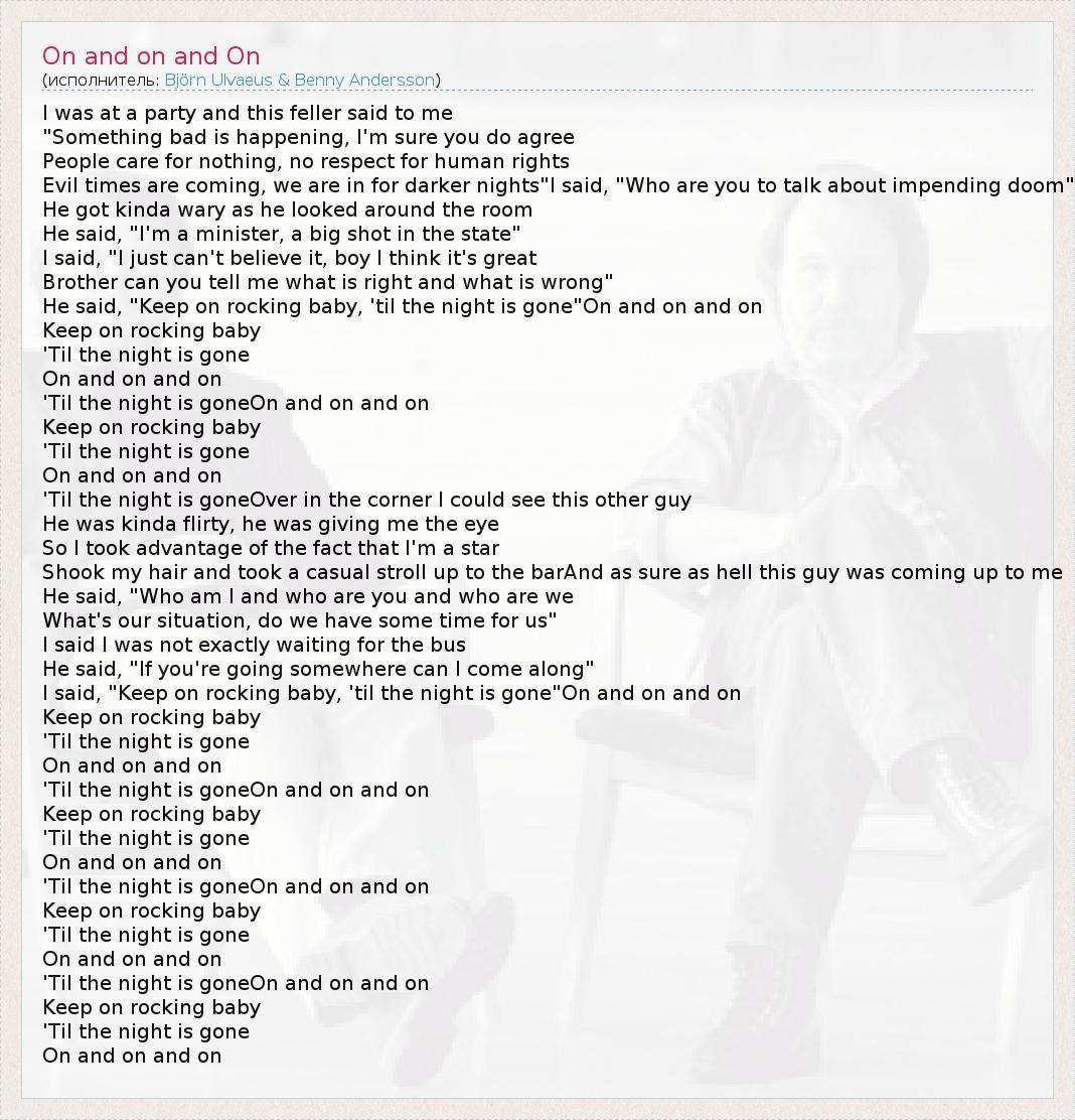 I said, "Keep on rocking baby, 'til the night is gone"On and on and on