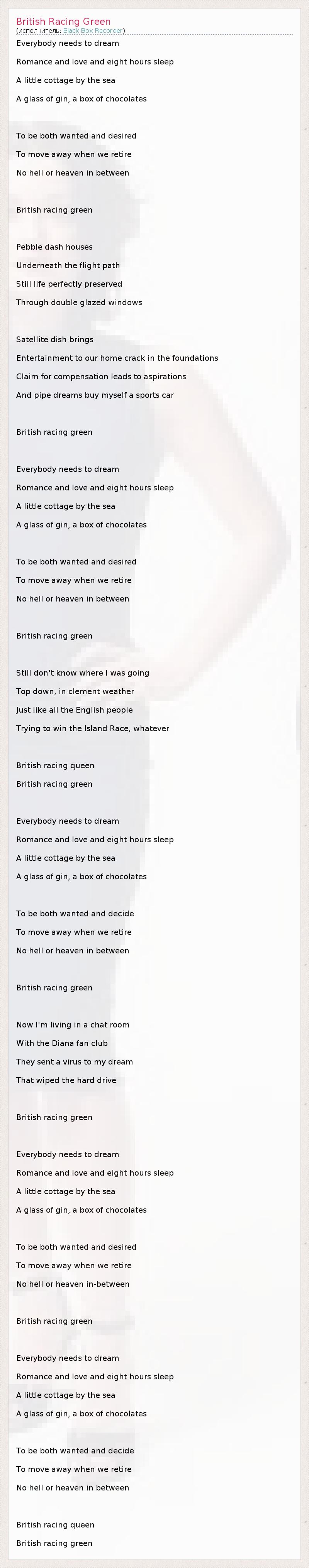Everybody needs to dream Romance and love and eight hours sleep A little cottage by the sea A glass of gin, a box of chocolates To be both wanted and desired To move away when we retire No hell or heaven in between British racing green Pebble dash houses Underneath the flight path Still life perfectly preserved Through double glazed windows Satellite dish brings Entertainment to our home crack in the foundations Claim for compensation leads to aspirations And pipe dreams buy myself a sports car British racing green Everybody needs to dream Romance and love and eight hours sleep A little cottage by the sea A glass of gin, a box of chocolates To be both wanted and desired To move away when we retire No hell or heaven in between British racing green Still don't know where I was going Top down, in clement weather Just like all the English people Trying to win the Island Race, whatever British racing queen British racing green Everybody needs to dream Romance and love and eight hours sleep A little cottage by the sea A glass of gin, a box of chocolates To be both wanted and decide To move away when we retire No hell or heaven in between British racing green Now I'm living in a chat room With the Diana fan club They sent a virus to my dream That wiped the hard drive British racing green Everybody needs to dream Romance and love and eight hours sleep A little cottage by the sea A glass of gin, a box of chocolates To be both wanted and desired To move away when we retire No hell or heaven in-between British racing green Everybody needs to dream Romance and love and eight hours sleep A little cottage by the sea A glass of gin, a box of chocolates To be both wanted and decide To move away when we retire No hell or heaven in between British racing queen British racing green
