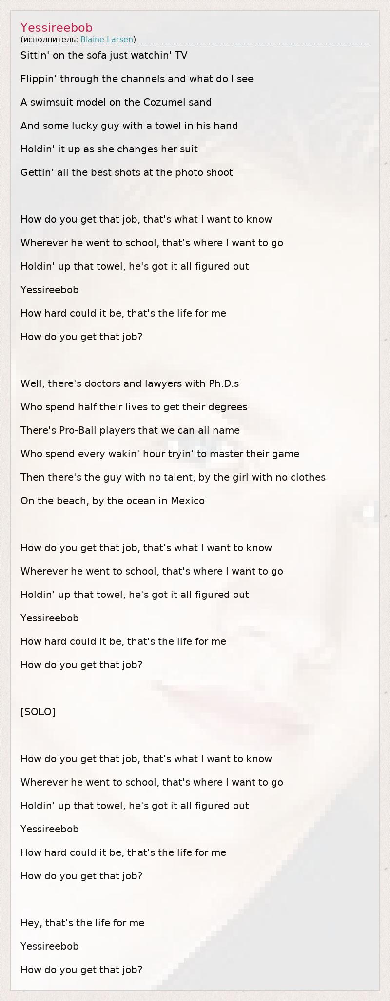 Sittin' on the sofa just watchin' TV Flippin' through the channels and what do I see A swimsuit model on the Cozumel sand And some lucky guy with a towel in his hand Holdin' it up as she changes her suit Gettin' all the best shots at the photo shoot How do you get that job, that's what I want to know Wherever he went to school, that's where I want to go Holdin' up that towel, he's got it all figured out Yessireebob How hard could it be, that's the life for me How do you get that job? Well, there's doctors and lawyers with Ph.D.s Who spend half their lives to get their degrees There's Pro-Ball players that we can all name Who spend every wakin' hour tryin' to master their game Then there's the guy with no talent, by the girl with no clothes On the beach, by the ocean in Mexico How do you get that job, that's what I want to know Wherever he went to school, that's where I want to go Holdin' up that towel, he's got it all figured out Yessireebob How hard could it be, that's the life for me How do you get that job? [SOLO] How do you get that job, that's what I want to know Wherever he went to school, that's where I want to go Holdin' up that towel, he's got it all figured out Yessireebob How hard could it be, that's the life for me How do you get that job? Hey, that's the life for me Yessireebob How do you get that job?