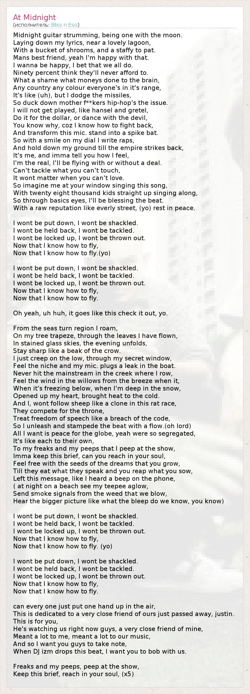 Полночь гитара бренчал , являясь одним с луной. Укладка мои стихи , рядом с прекрасной лагуной , С ведром грибы и и Staffy потрепать . Ман лучший друг, да я доволен этим. Я хочу быть счастливым , я уверен , что мы все делаем . Девяносто процентов думают, что они никогда не позволить себе . Какая жалость , что денежные средства, сделано в мозг , Любая страна любой цвет каждого в это диапазоне , Это как ( э ) , но я увернуться от ракеты , Так утка вниз мать F ** KERS хип-хопа вопрос . Я не буду играли , как Гензель и Гретель , Сделайте это для доллара, или танец с дьяволом , Вы знаете, почему , Потому я знаю, как дать отпор , И превратить этот микрофон . стоять в шип битой. Так с улыбкой на циферблате я пишу рэп , И удерживая на своем до империя наносит ответный удар , Это я, и МАЗМ рассказать вам, как я чувствую , Я настоящий , я буду летать с или без сделки. Не можете решить , что вы не можете коснуться , Это не будет иметь значения , когда вы не можете любить . Итак, представьте меня в окне петь эту песню, С двадцать восемь тысяч детей прямо подпевали , Так через Основы глаза , я буду благословлять ритм. С сыром репутации как Everly улице , ( лет) отдых в мире . Я не буду положить вниз, я не буду скованы . Я не буду сдерживаться , я не буду решать. Я не буду заперт , я не буду выброшен. Теперь, когда я знаю, как летать, Теперь, когда я знаю, как летать. ( Лет) Я не буду положить вниз, я не буду скованы . Я не буду сдерживаться , я не буду решать. Я не буду заперт , я не буду выброшен. Теперь, когда я знаю, как летать, Теперь, когда я знаю, как летать. Ах да , ну да , это выглядит следующим образом проверить его , йо . От моря превратить регион я бродить , На моем дерева трапеции , сквозь листву Я летал , В витражными небе , вечер разворачивается, Оставайтесь острый как клюв ворона . Я просто ползать понизко, через мой тайного окна , Почувствуйте нишу и мой микрофон . подключается утечку в лодке. Никогда не попал в основной в ручье , где я подряд, Почувствуйте Ветер в ивах от бриза , когда он , Когда это замораживание ниже , когда я в снегу , Открыл свое сердце , принес тепло в холода. И я , не будет следовать овец как клон в этой крысиной гонке , Они конкурируют за трон , Лечить свободу слова как нарушение кодекса , Так что я раскрыть и паническое бегство ритм с потоком . ( О боже ) Все, что я хочу, это мир в мире , да так отделены , Это как каждый к их собственному , Для моих уродов и моих выглядывает , что пищу на выставке , Имма держать это резюме , вы можете достичь в своей душе , Не стесняйтесь с семенами мечты, которые вы выращиваете , Пока они едят то, что они говорят и пожнешь , то и пожнешь , Слева это сообщение , как я услышал звуковой сигнал по телефону, (Ночью на пляже см. мой вигвам светилась , Отправить дымовые сигналы от сорняков , что мы дуть , Слушайте более широкую картину как то, что мы знаем ли мы знаем , вы знаете ) Я не буду положить вниз, я не буду скованы . Я не буду сдерживаться , я не буду решать. Я не буду заперт , я не буду выброшен. Теперь, когда я знаю, как летать, Теперь, когда я знаю, как летать. ( лет) Я не буду положить вниз, я не буду скованы . Я не буду сдерживаться , я не буду решать. Я не буду заперт , я не буду выброшен. Теперь, когда я знаю, как летать, Теперь, когда я знаю, как летать. может каждый просто положить одну руку в воздухе , Это посвящен очень близкого друга нашего только что скончался , Джастин . Это для вас , Он 