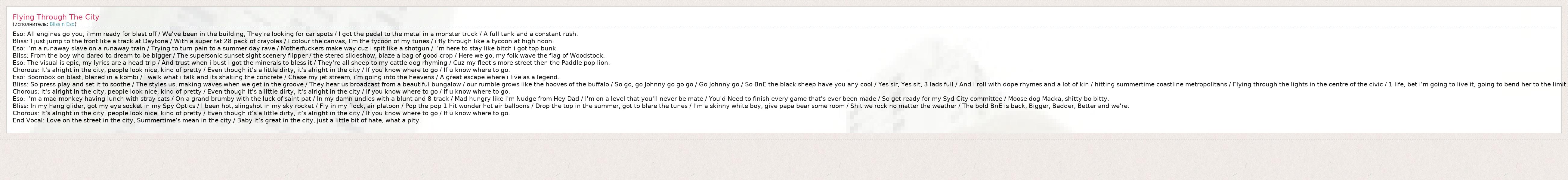 Bliss: So press play and set it to soothe / The styles us, making waves when we get in the groove / They hear us broadcast from a beautiful bungalow / our rumble grows like the hooves of the buffalo / So go, go Johnny go go go / Go Johnny go / So BnE the black sheep have you any cool / Yes sir, Yes sit, 3 lads full / And i roll with dope rhymes and a lot of kin / hitting summertime coastline metropolitans / Flying through the lights in the centre of the civic / 1 life, bet i'm going to live it, going to bend her to the limit.