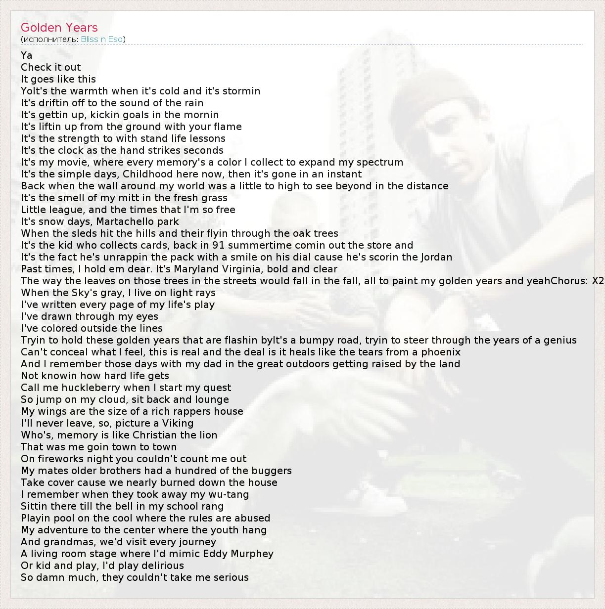 Ya Check it out It goes like this YoIt's the warmth when it's cold and it's stormin It's driftin off to the sound of the rain It's gettin up, kickin goals in the mornin It's liftin up from the ground with your flame It's the strength to with stand life lessons It's the clock as the hand strikes seconds It's my movie, where every memory's a color I collect to expand my spectrum It's the simple days, Childhood here now, then it's gone in an instant Back when the wall around my world was a little to high to see beyond in the distance It's the smell of my mitt in the fresh grass Little league, and the times that I'm so free It's snow days, Martachello park When the sleds hit the hills and their flyin through the oak trees It's the kid who collects cards, back in 91 summertime comin out the store and It's the fact he's unrappin the pack with a smile on his dial cause he's scorin the Jordan Past times, I hold em dear. It's Maryland Virginia, bold and clear The way the leaves on those trees in the streets would fall in the fall, all to paint my golden years and yeahChorus: X2 When the Sky's gray, I live on light rays I've written every page of my life's play I've drawn through my eyes I've colored outside the lines Tryin to hold these golden years that are flashin byIt's a bumpy road, tryin to steer through the years of a genius Can't conceal what I feel, this is real and the deal is it heals like the tears from a phoenix And I remember those days with my dad in the great outdoors getting raised by the land Not knowin how hard life gets Call me huckleberry when I start my quest So jump on my cloud, sit back and lounge My wings are the size of a rich rappers house I'll never leave, so, picture a Viking Who's, memory is like Christian the lion That was me goin town to town On fireworks night you couldn't count me out My mates older brothers had a hundred of the buggers Take cover cause we nearly burned down the house I remember when they took away my wu-tang Sittin there till the bell in my school rang Playin pool on the cool where the rules are abused My adventure to the center where the youth hang And grandmas, we'd visit every journey A living room stage where I'd mimic Eddy Murphey Or kid and play, I'd play delirious So damn much, they couldn't take me serious