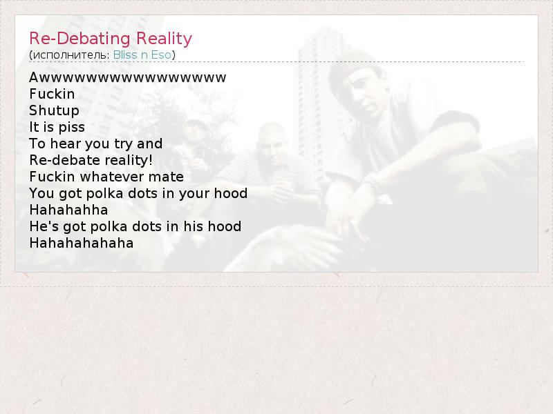 А как ты думаешь, о чем песня "Re-Debating Reality" ?