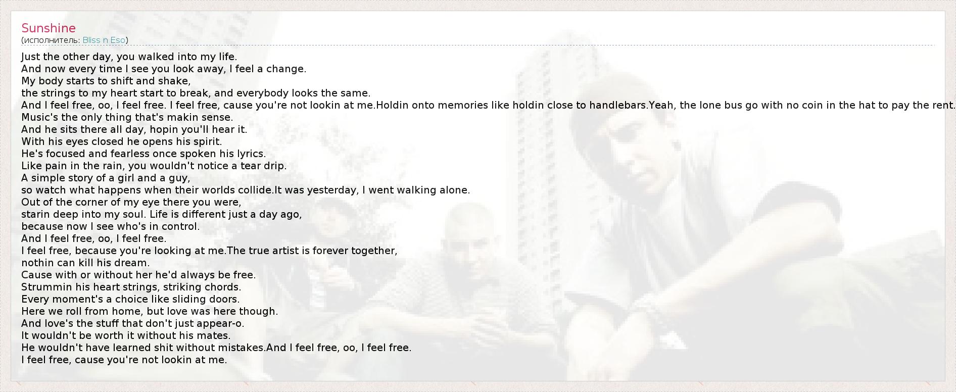 Just the other day, you walked into my life. And now every time I see you look away, I feel a change. My body starts to shift and shake, the strings to my heart start to break, and everybody looks the same. And I feel free, oo, I feel free. I feel free, cause you're not lookin at me.Holdin onto memories like holdin close to handlebars.Yeah, the lone bus go with no coin in the hat to pay the rent. Music's the only thing that's makin sense. And he sits there all day, hopin you'll hear it. With his eyes closed he opens his spirit. He's focused and fearless once spoken his lyrics. Like pain in the rain, you wouldn't notice a tear drip. A simple story of a girl and a guy, so watch what happens when their worlds collide.It was yesterday, I went walking alone. Out of the corner of my eye there you were, starin deep into my soul. Life is different just a day ago, because now I see who's in control. And I feel free, oo, I feel free. I feel free, because you're looking at me.The true artist is forever together, nothin can kill his dream. Cause with or without her he'd always be free. Strummin his heart strings, striking chords. Every moment's a choice like sliding doors. Here we roll from home, but love was here though. And love's the stuff that don't just appear-o. It wouldn't be worth it without his mates. He wouldn't have learned shit without mistakes.And I feel free, oo, I feel free. I feel free, cause you're not lookin at me.
