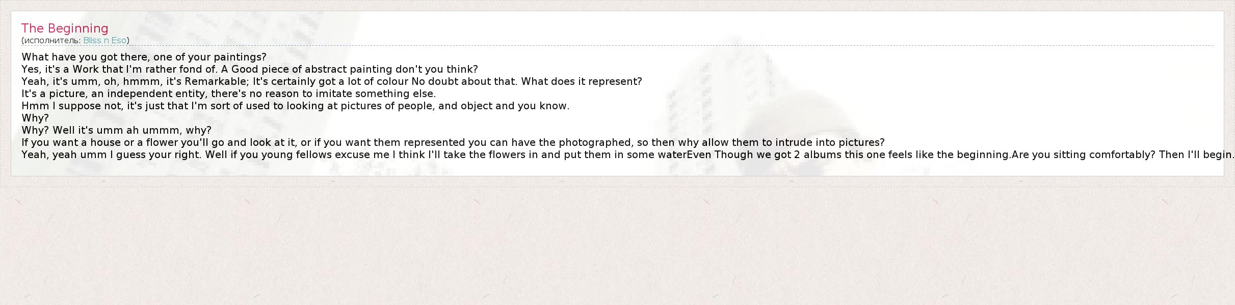 What have you got there, one of your paintings? Yes, it's a Work that I'm rather fond of. A Good piece of abstract painting don't you think? Yeah, it's umm, oh, hmmm, it's Remarkable; It's certainly got a lot of colour No doubt about that. What does it represent? It's a picture, an independent entity, there's no reason to imitate something else. Hmm I suppose not, it's just that I'm sort of used to looking at pictures of people, and object and you know. Why? Why? Well it's umm ah ummm, why? If you want a house or a flower you'll go and look at it, or if you want them represented you can have the photographed, so then why allow them to intrude into pictures? Yeah, yeah umm I guess your right. Well if you young fellows excuse me I think I'll take the flowers in and put them in some waterEven Though we got 2 albums this one feels like the beginning.Are you sitting comfortably? Then I'll begin.