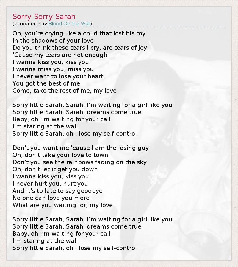 Oh, you're crying like a child that lost his toy In the shadows of your love Do you think these tears I cry, are tears of joy 'Cause my tears are not enough I wanna kiss you, kiss you I wanna miss you, miss you I never want to lose your heart You got the best of me Come, take the rest of me, my love Sorry little Sarah, Sarah, I'm waiting for a girl like you Sorry little Sarah, Sarah, dreams come true Baby, oh I'm waiting for your call I'm staring at the wall Sorry little Sarah, oh I lose my self-control Don't you want me 'cause I am the losing guy Oh, don't take your love to town Don't you see the rainbows fading on the sky Oh, don't let it get you down I wanna kiss you, kiss you I never hurt you, hurt you And it's to late to say goodbye No one can love you more What are you waiting for, my love Sorry little Sarah, Sarah, I'm waiting for a girl like you Sorry little Sarah, Sarah, dreams come true Baby, oh I'm waiting for your call I'm staring at the wall Sorry little Sarah, oh I lose my self-control