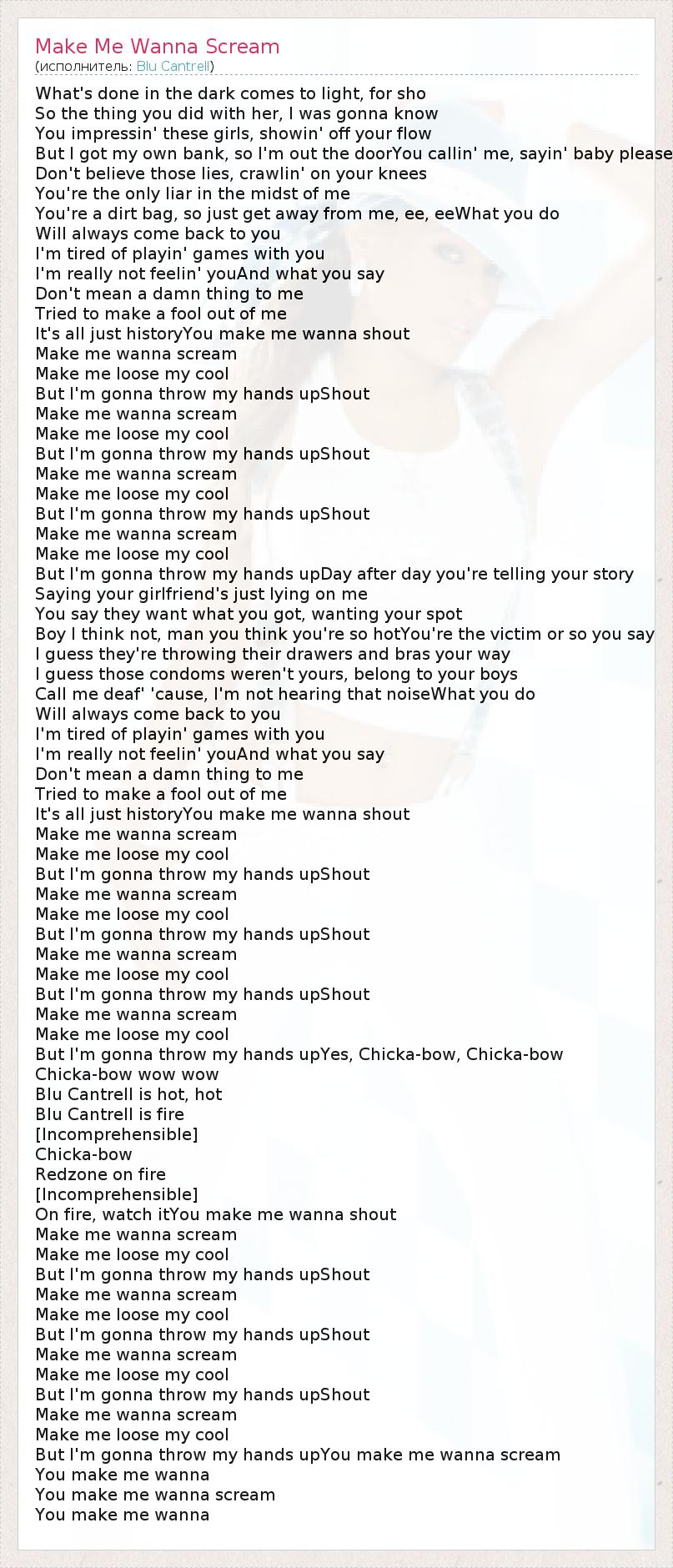 What's done in the dark comes to light, for sho So the thing you did with her, I was gonna know You impressin' these girls, showin' off your flow But I got my own bank, so I'm out the doorYou callin' me, sayin' baby please Don't believe those lies, crawlin' on your knees You're the only liar in the midst of me You're a dirt bag, so just get away from me, ee, eeWhat you do Will always come back to you I'm tired of playin' games with you I'm really not feelin' youAnd what you say Don't mean a damn thing to me Tried to make a fool out of me It's all just historyYou make me wanna shout Make me wanna scream Make me loose my cool But I'm gonna throw my hands upShout Make me wanna scream Make me loose my cool But I'm gonna throw my hands upShout Make me wanna scream Make me loose my cool But I'm gonna throw my hands upShout Make me wanna scream Make me loose my cool But I'm gonna throw my hands upDay after day you're telling your story Saying your girlfriend's just lying on me You say they want what you got, wanting your spot Boy I think not, man you think you're so hotYou're the victim or so you say I guess they're throwing their drawers and bras your way I guess those condoms weren't yours, belong to your boys Call me deaf' 'cause, I'm not hearing that noiseWhat you do Will always come back to you I'm tired of playin' games with you I'm really not feelin' youAnd what you say Don't mean a damn thing to me Tried to make a fool out of me It's all just historyYou make me wanna shout Make me wanna scream Make me loose my cool But I'm gonna throw my hands upShout Make me wanna scream Make me loose my cool But I'm gonna throw my hands upShout Make me wanna scream Make me loose my cool But I'm gonna throw my hands upShout Make me wanna scream Make me loose my cool But I'm gonna throw my hands upYes, Chicka-bow, Chicka-bow Chicka-bow wow wow Blu Cantrell is hot, hot Blu Cantrell is fire [Incomprehensible] Chicka-bow Redzone on fire [Incomprehensible] On fire, watch itYou make me wanna shout Make me wanna scream Make me loose my cool But I'm gonna throw my hands upShout Make me wanna scream Make me loose my cool But I'm gonna throw my hands upShout Make me wanna scream Make me loose my cool But I'm gonna throw my hands upShout Make me wanna scream Make me loose my cool But I'm gonna throw my hands upYou make me wanna scream You make me wanna You make me wanna scream You make me wanna