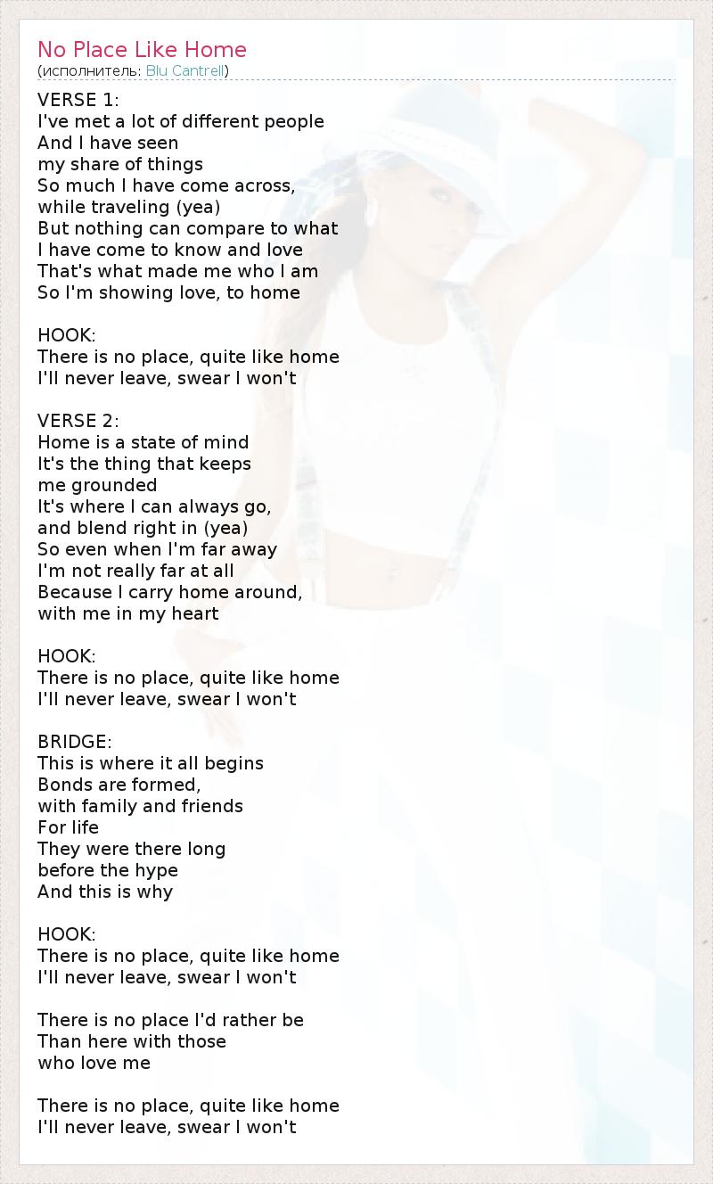 VERSE 1: I've met a lot of different people And I have seen my share of things So much I have come across, while traveling (yea) But nothing can compare to what I have come to know and love That's what made me who I am So I'm showing love, to home HOOK: There is no place, quite like home I'll never leave, swear I won't VERSE 2: Home is a state of mind It's the thing that keeps me grounded It's where I can always go, and blend right in (yea) So even when I'm far away I'm not really far at all Because I carry home around, with me in my heart HOOK: There is no place, quite like home I'll never leave, swear I won't BRIDGE: This is where it all begins Bonds are formed, with family and friends For life They were there long before the hype And this is why HOOK: There is no place, quite like home I'll never leave, swear I won't There is no place I'd rather be Than here with those who love me There is no place, quite like home I'll never leave, swear I won't