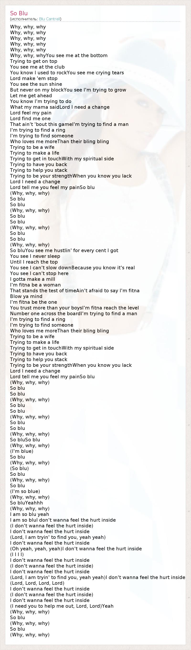 Why, why, why Why, why, why Why, why, why Why, why, why Why, why, why Why, why, whyYou see me at the bottom Trying to get on top You see me at the club You know I used to rockYou see me crying tears Lord make 'em stop You see the sun shine But never on my blockYou see I'm trying to grow Let me get ahead You know I'm trying to do What my mama saidLord I need a change Lord feel my pain Lord find me one That ain't 'bout this gameI'm trying to find a man I'm trying to find a ring I'm trying to find someone Who loves me moreThan their bling bling Trying to be a wife Trying to make a life Trying to get in touchWith my spiritual side Trying to have you back Trying to help you stack Trying to be your strengthWhen you know you lack Lord I need a change Lord tell me you feel my painSo blu (Why, why, why) So blu So blu (Why, why, why) So blu So blu (Why, why, why) So blu So blu (Why, why, why) So bluYou see me hustlin' for every cent I got You see I never sleep Until I reach the top You see I can't slow downBecause you know it's real You see I can't stop here I gotta make a mill I'm fitna be a woman That stands the test of timeAin't afraid to say I'm fitna Blow ya mind I'm fitna be the one You trust more than your boysI'm fitna reach the level Number one across the boardI'm trying to find a man I'm trying to find a ring I'm trying to find someone Who loves me moreThan their bling bling Trying to be a wife Trying to make a life Trying to get in touchWith my spiritual side Trying to have you back Trying to help you stack Trying to be your strengthWhen you know you lack Lord I need a change Lord tell me you feel my painSo blu (Why, why, why) So blu So blu (Why, why, why) So blu So blu (Why, why, why) So blu So blu (Why, why, why) So bluSo blu (Why, why, why) (I'm blue) So blu (Why, why, why) (So blu) So blu (Why, why, why) So blu (I'm so blue) (Why, why, why) So bluYeahhh (Why, why, why) I am so blu yeah I am so bluI don't wanna feel the hurt inside (I don't wanna feel the hurt inside) I don't wanna feel the hurt inside (Lord, I am tryin' to find you, yeah yeah) I don't wanna feel the hurt inside (Oh yeah, yeah, yeah)I don't wanna feel the hurt inside (I I I I) I don't wanna feel the hurt inside (I don't wanna feel the hurt inside) I don't wanna feel the hurt inside (Lord, I am tryin' to find you, yeah yeah)I don't wanna feel the hurt inside (Lord, Lord, Lord, Lord) I don't wanna feel the hurt inside (I don't wanna feel the hurt inside) I don't wanna feel the hurt inside (I need you to help me out, Lord, Lord)Yeah (Why, why, why) So blu (Why, why, why) So blu (Why, why, why)