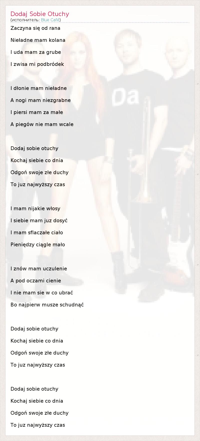 Zaczyna się od rana Nieładne mam kolana I uda mam za grube I zwisa mi podbródek I dłonie mam nieładne A nogi mam niezgrabne I piersi mam za małe A piegów nie mam wcale Dodaj sobie otuchy Kochaj siebie co dnia Odgoń swoje złe duchy To juz najwyższy czas I mam nijakie włosy I siebie mam juz dosyć I mam sflaczałe ciało Pieniędzy ciągle mało I znów mam uczulenie A pod oczami cienie I nie mam sie w co ubrać Bo najpierw musze schudnąć Dodaj sobie otuchy Kochaj siebie co dnia Odgoń swoje złe duchy To juz najwyższy czas Dodaj sobie otuchy Kochaj siebie co dnia Odgoń swoje złe duchy To juz najwyższy czas