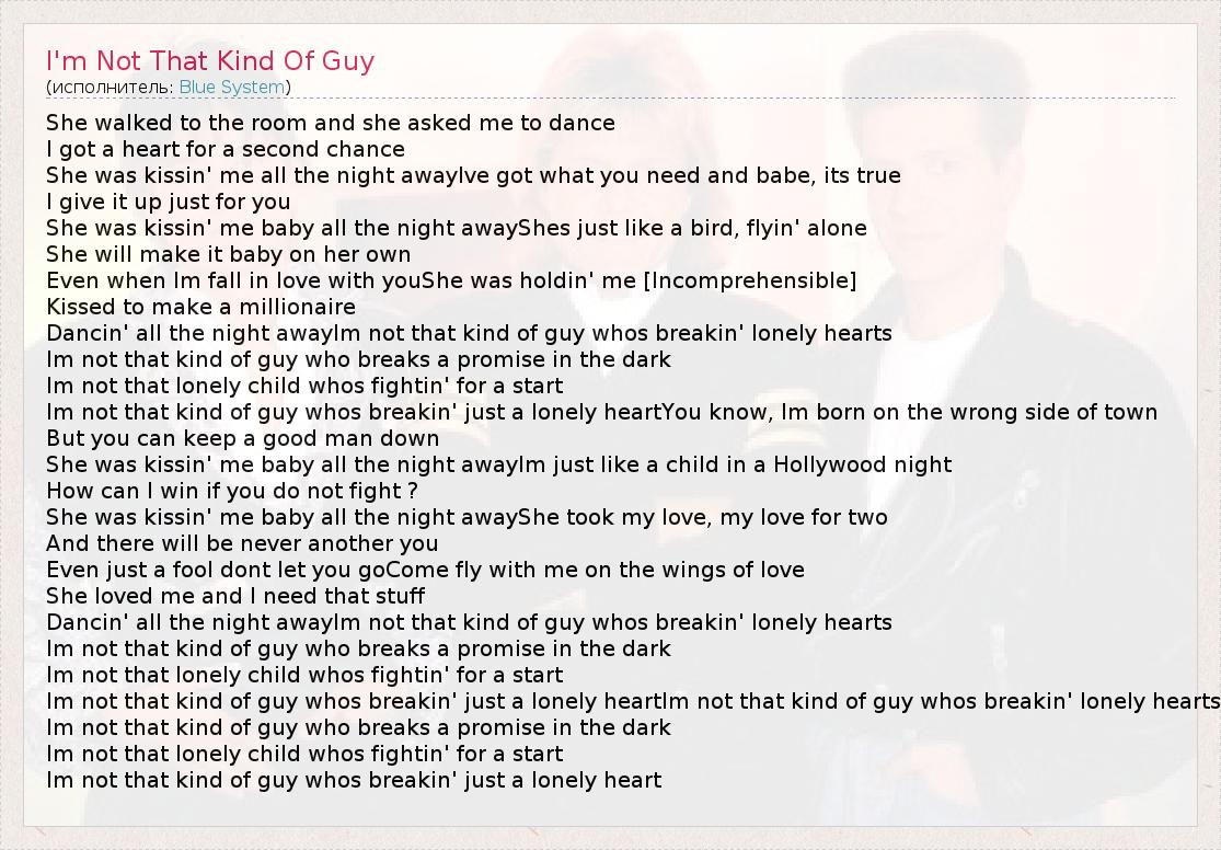 She walked to the room and she asked me to dance I got a heart for a second chance She was kissin' me all the night awayIve got what you need and babe, its true I give it up just for you She was kissin' me baby all the night awayShes just like a bird, flyin' alone She will make it baby on her own Even when Im fall in love with youShe was holdin' me [Incomprehensible] Kissed to make a millionaire Dancin' all the night awayIm not that kind of guy whos breakin' lonely hearts Im not that kind of guy who breaks a promise in the dark Im not that lonely child whos fightin' for a start Im not that kind of guy whos breakin' just a lonely heartYou know, Im born on the wrong side of town But you can keep a good man down She was kissin' me baby all the night awayIm just like a child in a Hollywood night How can I win if you do not fight ? She was kissin' me baby all the night awayShe took my love, my love for two And there will be never another you Even just a fool dont let you goCome fly with me on the wings of love She loved me and I need that stuff Dancin' all the night awayIm not that kind of guy whos breakin' lonely hearts Im not that kind of guy who breaks a promise in the dark Im not that lonely child whos fightin' for a start Im not that kind of guy whos breakin' just a lonely heartIm not that kind of guy whos breakin' lonely hearts Im not that kind of guy who breaks a promise in the dark Im not that lonely child whos fightin' for a start Im not that kind of guy whos breakin' just a lonely heart