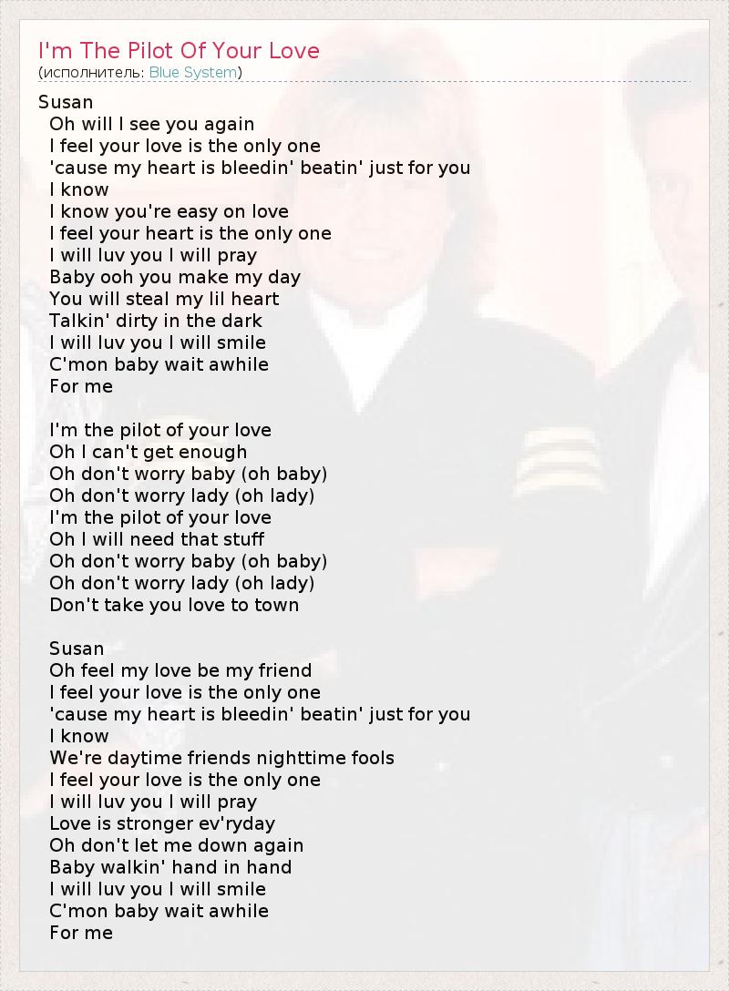Susan Oh will I see you again I feel your love is the only one 'cause my heart is bleedin' beatin' just for you I know I know you're easy on love I feel your heart is the only one I will luv you I will pray Baby ooh you make my day You will steal my lil heart Talkin' dirty in the dark I will luv you I will smile C'mon baby wait awhile For me I'm the pilot of your love Oh I can't get enough Oh don't worry baby (oh baby) Oh don't worry lady (oh lady) I'm the pilot of your love Oh I will need that stuff Oh don't worry baby (oh baby) Oh don't worry lady (oh lady) Don't take you love to town Susan Oh feel my love be my friend I feel your love is the only one 'cause my heart is bleedin' beatin' just for you I know We're daytime friends nighttime fools I feel your love is the only one I will luv you I will pray Love is stronger ev'ryday Oh don't let me down again Baby walkin' hand in hand I will luv you I will smile C'mon baby wait awhile For me