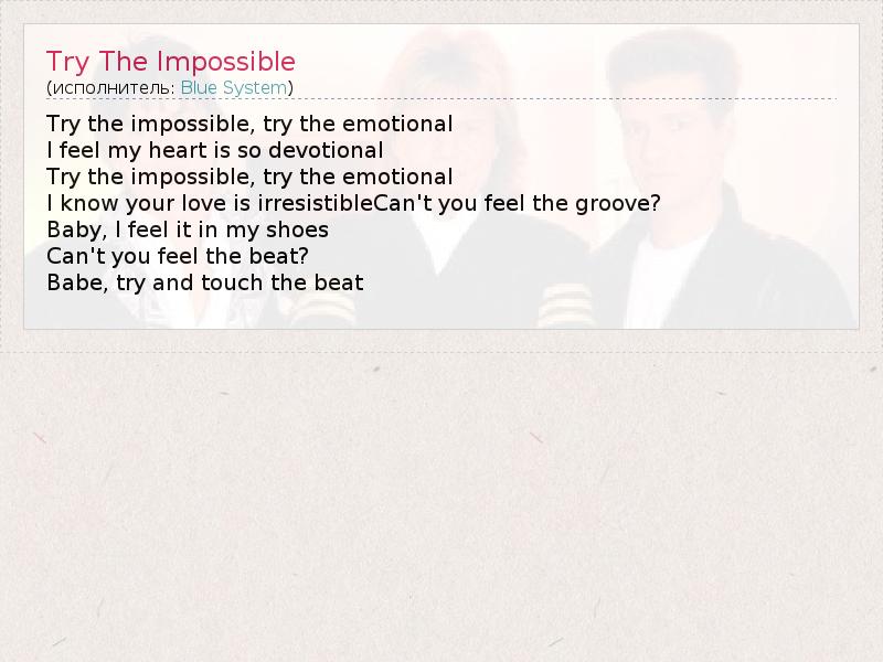 Try the impossible, try the emotional I feel my heart is so devotional Try the impossible, try the emotional I know your love is irresistibleCan't you feel the groove? Baby, I feel it in my shoes Can't you feel the beat? Babe, try and touch the beat