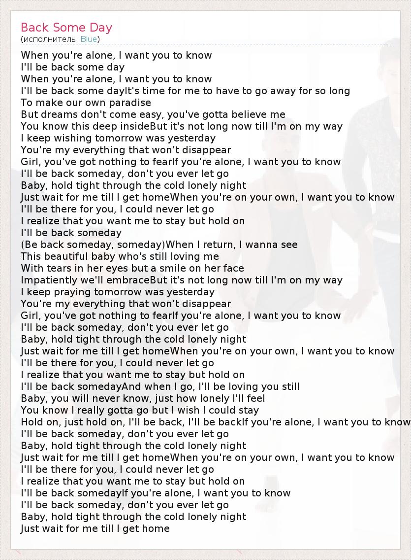 When you're alone, I want you to know I'll be back some day When you're alone, I want you to know I'll be back some dayIt's time for me to have to go away for so long To make our own paradise But dreams don't come easy, you've gotta believe me You know this deep insideBut it's not long now till I'm on my way I keep wishing tomorrow was yesterday You're my everything that won't disappear Girl, you've got nothing to fearIf you're alone, I want you to know I'll be back someday, don't you ever let go Baby, hold tight through the cold lonely night Just wait for me till I get homeWhen you're on your own, I want you to know I'll be there for you, I could never let go I realize that you want me to stay but hold on I'll be back someday (Be back someday, someday)When I return, I wanna see This beautiful baby who's still loving me With tears in her eyes but a smile on her face Impatiently we'll embraceBut it's not long now till I'm on my way I keep praying tomorrow was yesterday You're my everything that won't disappear Girl, you've got nothing to fearIf you're alone, I want you to know I'll be back someday, don't you ever let go Baby, hold tight through the cold lonely night Just wait for me till I get homeWhen you're on your own, I want you to know I'll be there for you, I could never let go I realize that you want me to stay but hold on I'll be back somedayAnd when I go, I'll be loving you still Baby, you will never know, just how lonely I'll feel You know I really gotta go but I wish I could stay Hold on, just hold on, I'll be back, I'll be backIf you're alone, I want you to know I'll be back someday, don't you ever let go Baby, hold tight through the cold lonely night Just wait for me till I get homeWhen you're on your own, I want you to know I'll be there for you, I could never let go I realize that you want me to stay but hold on I'll be back somedayIf you're alone, I want you to know I'll be back someday, don't you ever let go Baby, hold tight through the cold lonely night Just wait for me till I get home