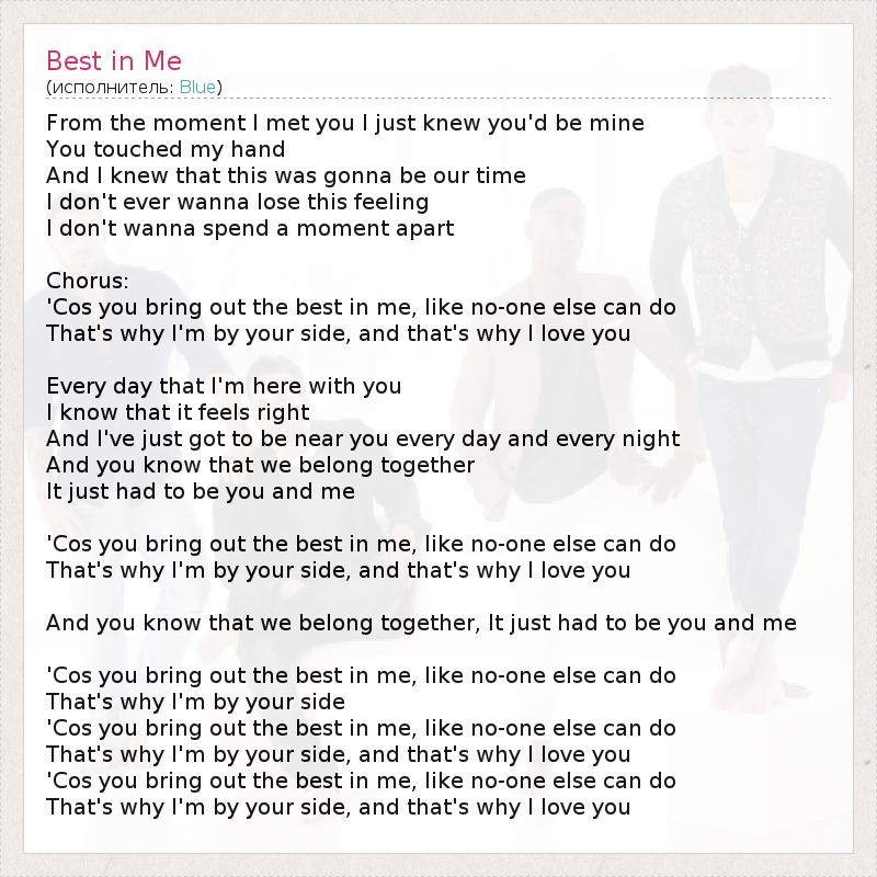 From the moment I met you I just knew you'd be mine You touched my hand And I knew that this was gonna be our time I don't ever wanna lose this feeling I don't wanna spend a moment apart Chorus: 'Cos you bring out the best in me, like no-one else can do That's why I'm by your side, and that's why I love you Every day that I'm here with you I know that it feels right And I've just got to be near you every day and every night And you know that we belong together It just had to be you and me 'Cos you bring out the best in me, like no-one else can do That's why I'm by your side, and that's why I love you And you know that we belong together, It just had to be you and me 'Cos you bring out the best in me, like no-one else can do That's why I'm by your side 'Cos you bring out the best in me, like no-one else can do That's why I'm by your side, and that's why I love you 'Cos you bring out the best in me, like no-one else can do That's why I'm by your side, and that's why I love you
