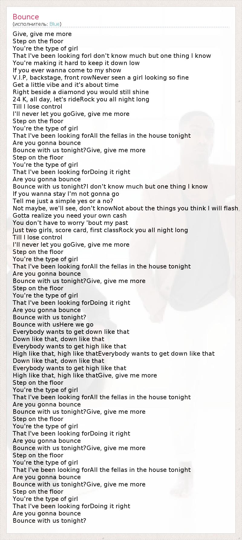 Give, give me more Step on the floor You're the type of girl That I've been looking forI don't know much but one thing I know You're making it hard to keep it down low If you ever wanna come to my show V.I.P, backstage, front rowNever seen a girl looking so fine Get a little vibe and it's about time Right beside a diamond you would still shine 24 K, all day, let's rideRock you all night long Till I lose control I'll never let you goGive, give me more Step on the floor You're the type of girl That I've been looking forAll the fellas in the house tonight Are you gonna bounce Bounce with us tonight?Give, give me more Step on the floor You're the type of girl That I've been looking forDoing it right Are you gonna bounce Bounce with us tonight?I don't know much but one thing I know If you wanna stay I'm not gonna go Tell me just a simple yes or a no? Not maybe, we'll see, don't knowNot about the things you think I will flash Gotta realize you need your own cash You don't have to worry 'bout my past Just two girls, score card, first classRock you all night long Till I lose control I'll never let you goGive, give me more Step on the floor You're the type of girl That I've been looking forAll the fellas in the house tonight Are you gonna bounce Bounce with us tonight?Give, give me more Step on the floor You're the type of girl That I've been looking forDoing it right Are you gonna bounce Bounce with us tonight? Bounce with usHere we go Everybody wants to get down like that Down like that, down like that Everybody wants to get high like that High like that, high like thatEverybody wants to get down like that Down like that, down like that Everybody wants to get high like that High like that, high like thatGive, give me more Step on the floor You're the type of girl That I've been looking forAll the fellas in the house tonight Are you gonna bounce Bounce with us tonight?Give, give me more Step on the floor You're the type of girl That I've been looking forDoing it right Are you gonna bounce Bounce with us tonight?Give, give me more Step on the floor You're the type of girl That I've been looking forAll the fellas in the house tonight Are you gonna bounce Bounce with us tonight?Give, give me more Step on the floor You're the type of girl That I've been looking forDoing it right Are you gonna bounce Bounce with us tonight?