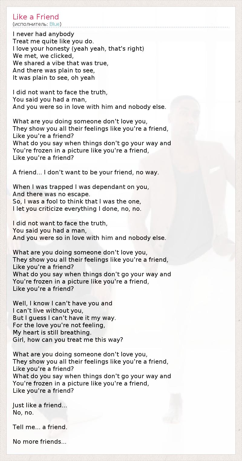 I never had anybody Treat me quite like you do. I love your honesty (yeah yeah, that's right) We met, we clicked, We shared a vibe that was true, And there was plain to see, It was plain to see, oh yeah I did not want to face the truth, You said you had a man, And you were so in love with him and nobody else. What are you doing someone don't love you, They show you all their feelings like you're a friend, Like you're a friend? What do you say when things don't go your way and You're frozen in a picture like you're a friend, Like you're a friend? A friend... I don't want to be your friend, no way. When I was trapped I was dependant on you, And there was no escape. So, I was a fool to think that I was the one, I let you criticize everything I done, no, no. I did not want to face the truth, You said you had a man, And you were so in love with him and nobody else. What are you doing someone don't love you, They show you all their feelings like you're a friend, Like you're a friend? What do you say when things don't go your way and You're frozen in a picture like you're a friend, Like you're a friend? Well, I know I can't have you and I can't live without you, But I guess I can't have it my way. For the love you're not feeling, My heart is still breathing. Girl, how can you treat me this way? What are you doing someone don't love you, They show you all their feelings like you're a friend, Like you're a friend? What do you say when things don't go your way and You're frozen in a picture like you're a friend, Like you're a friend? Just like a friend... No, no. Tell me... a friend. No more friends...