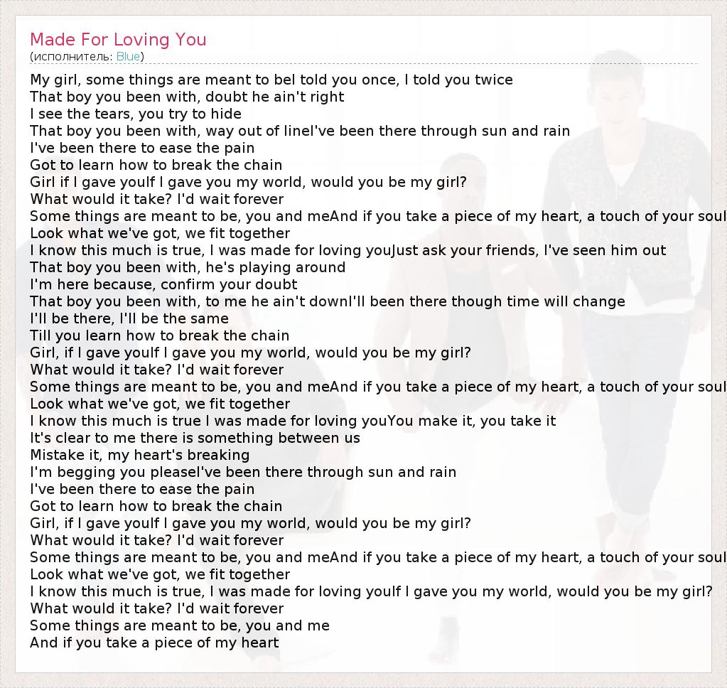 My girl, some things are meant to beI told you once, I told you twice That boy you been with, doubt he ain't right I see the tears, you try to hide That boy you been with, way out of lineI've been there through sun and rain I've been there to ease the pain Got to learn how to break the chain Girl if I gave youIf I gave you my world, would you be my girl? What would it take? I'd wait forever Some things are meant to be, you and meAnd if you take a piece of my heart, a touch of your soul Look what we've got, we fit together I know this much is true, I was made for loving youJust ask your friends, I've seen him out That boy you been with, he's playing around I'm here because, confirm your doubt That boy you been with, to me he ain't downI'll been there though time will change I'll be there, I'll be the same Till you learn how to break the chain Girl, if I gave youIf I gave you my world, would you be my girl? What would it take? I'd wait forever Some things are meant to be, you and meAnd if you take a piece of my heart, a touch of your soul Look what we've got, we fit together I know this much is true I was made for loving youYou make it, you take it It's clear to me there is something between us Mistake it, my heart's breaking I'm begging you pleaseI've been there through sun and rain I've been there to ease the pain Got to learn how to break the chain Girl, if I gave youIf I gave you my world, would you be my girl? What would it take? I'd wait forever Some things are meant to be, you and meAnd if you take a piece of my heart, a touch of your soul Look what we've got, we fit together I know this much is true, I was made for loving youIf I gave you my world, would you be my girl? What would it take? I'd wait forever Some things are meant to be, you and me And if you take a piece of my heart