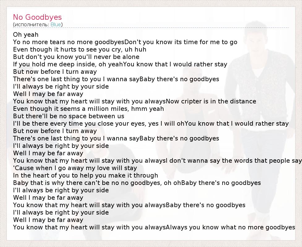 Oh yeah Yo no more tears no more goodbyesDon't you know its time for me to go Even though it hurts to see you cry, uh huh But don't you know you'll never be alone If you hold me deep inside, oh yeahYou know that I would rather stay But now before I turn away There's one last thing to you I wanna sayBaby there's no goodbyes I'll always be right by your side Well I may be far away You know that my heart will stay with you alwaysNow cripter is in the distance Even though it seems a million miles, hmm yeah But there'll be no space between us I'll be there every time you close your eyes, yes I will ohYou know that I would rather stay But now before I turn away There's one last thing to you I wanna sayBaby there's no goodbyes I'll always be right by your side Well I may be far away You know that my heart will stay with you alwaysI don't wanna say the words that people say 'Cause when I go away my love will stay In the heart of you to help you make it through Baby that is why there can't be no no goodbyes, oh ohBaby there's no goodbyes I'll always be right by your side Well I may be far away You know that my heart will stay with you alwaysBaby there's no goodbyes I'll always be right by your side Well I may be far away You know that my heart will stay with you alwaysAlways you know what no more goodbyes