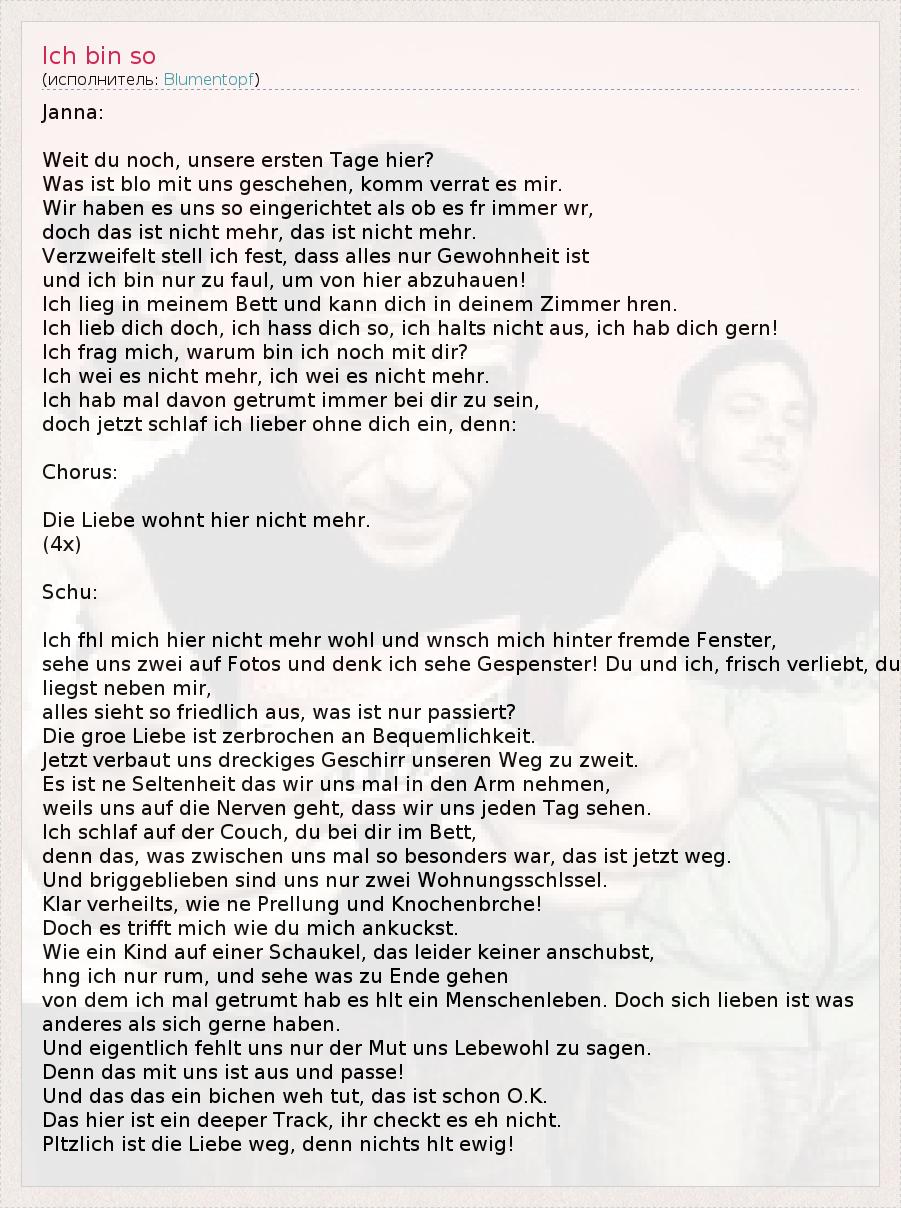 Janna: Weit du noch, unsere ersten Tage hier? Was ist blo mit uns geschehen, komm verrat es mir. Wir haben es uns so eingerichtet als ob es fr immer wr, doch das ist nicht mehr, das ist nicht mehr. Verzweifelt stell ich fest, dass alles nur Gewohnheit ist und ich bin nur zu faul, um von hier abzuhauen! Ich lieg in meinem Bett und kann dich in deinem Zimmer hren. Ich lieb dich doch, ich hass dich so, ich halts nicht aus, ich hab dich gern! Ich frag mich, warum bin ich noch mit dir? Ich wei es nicht mehr, ich wei es nicht mehr. Ich hab mal davon getrumt immer bei dir zu sein, doch jetzt schlaf ich lieber ohne dich ein, denn: Chorus: Die Liebe wohnt hier nicht mehr. (4x) Schu: Ich fhl mich hier nicht mehr wohl und wnsch mich hinter fremde Fenster, sehe uns zwei auf Fotos und denk ich sehe Gespenster! Du und ich, frisch verliebt, du liegst neben mir, alles sieht so friedlich aus, was ist nur passiert? Die groe Liebe ist zerbrochen an Bequemlichkeit. Jetzt verbaut uns dreckiges Geschirr unseren Weg zu zweit. Es ist ne Seltenheit das wir uns mal in den Arm nehmen, weils uns auf die Nerven geht, dass wir uns jeden Tag sehen. Ich schlaf auf der Couch, du bei dir im Bett, denn das, was zwischen uns mal so besonders war, das ist jetzt weg. Und briggeblieben sind uns nur zwei Wohnungsschlssel. Klar verheilts, wie ne Prellung und Knochenbrche! Doch es trifft mich wie du mich ankuckst. Wie ein Kind auf einer Schaukel, das leider keiner anschubst, hng ich nur rum, und sehe was zu Ende gehen von dem ich mal getrumt hab es hlt ein Menschenleben. Doch sich lieben ist was anderes als sich gerne haben. Und eigentlich fehlt uns nur der Mut uns Lebewohl zu sagen. Denn das mit uns ist aus und passe! Und das das ein bichen weh tut, das ist schon O.K. Das hier ist ein deeper Track, ihr checkt es eh nicht. Pltzlich ist die Liebe weg, denn nichts hlt ewig!