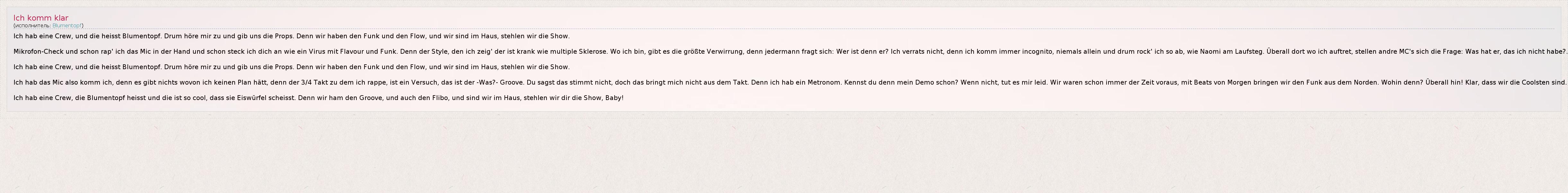 Ich hab eine Crew, die Blumentopf heisst und die ist so cool, dass sie Eiswürfel scheisst. Denn wir ham den Groove, und auch den Flibo, und sind wir im Haus, stehlen wir dir die Show, Baby!