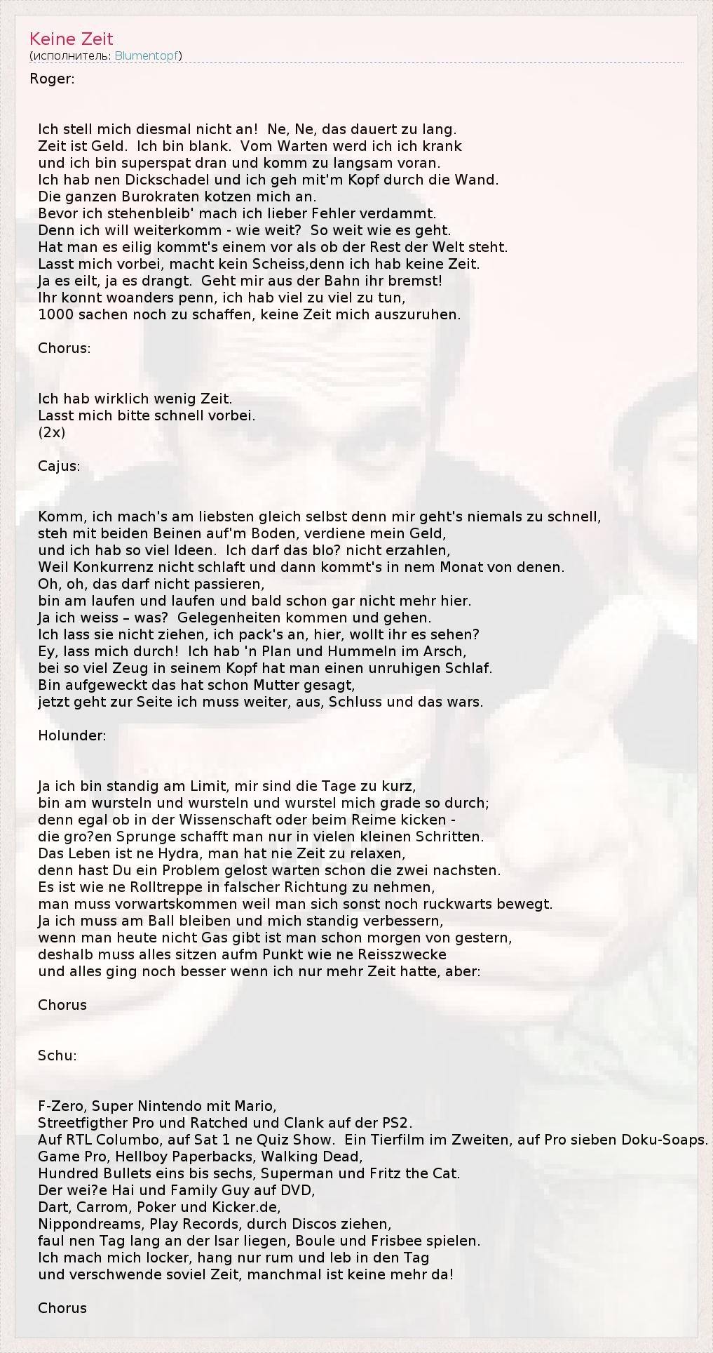 Roger: Ich stell mich diesmal nicht an! Ne, Ne, das dauert zu lang. Zeit ist Geld. Ich bin blank. Vom Warten werd ich ich krank und ich bin superspat dran und komm zu langsam voran. Ich hab nen Dickschadel und ich geh mit'm Kopf durch die Wand. Die ganzen Burokraten kotzen mich an. Bevor ich stehenbleib' mach ich lieber Fehler verdammt. Denn ich will weiterkomm - wie weit? So weit wie es geht. Hat man es eilig kommt's einem vor als ob der Rest der Welt steht. Lasst mich vorbei, macht kein Scheiss,denn ich hab keine Zeit. Ja es eilt, ja es drangt. Geht mir aus der Bahn ihr bremst! Ihr konnt woanders penn, ich hab viel zu viel zu tun, 1000 sachen noch zu schaffen, keine Zeit mich auszuruhen. Chorus: Ich hab wirklich wenig Zeit. Lasst mich bitte schnell vorbei. (2x) Cajus: Komm, ich mach's am liebsten gleich selbst denn mir geht's niemals zu schnell, steh mit beiden Beinen auf'm Boden, verdiene mein Geld, und ich hab so viel Ideen. Ich darf das blo? nicht erzahlen, Weil Konkurrenz nicht schlaft und dann kommt's in nem Monat von denen. Oh, oh, das darf nicht passieren, bin am laufen und laufen und bald schon gar nicht mehr hier. Ja ich weiss – was? Gelegenheiten kommen und gehen. Ich lass sie nicht ziehen, ich pack's an, hier, wollt ihr es sehen? Ey, lass mich durch! Ich hab 'n Plan und Hummeln im Arsch, bei so viel Zeug in seinem Kopf hat man einen unruhigen Schlaf. Bin aufgeweckt das hat schon Mutter gesagt, jetzt geht zur Seite ich muss weiter, aus, Schluss und das wars. Holunder: Ja ich bin standig am Limit, mir sind die Tage zu kurz, bin am wursteln und wursteln und wurstel mich grade so durch; denn egal ob in der Wissenschaft oder beim Reime kicken - die gro?en Sprunge schafft man nur in vielen kleinen Schritten. Das Leben ist ne Hydra, man hat nie Zeit zu relaxen, denn hast Du ein Problem gelost warten schon die zwei nachsten. Es ist wie ne Rolltreppe in falscher Richtung zu nehmen, man muss vorwartskommen weil man sich sonst noch ruckwarts bewegt. Ja ich muss am Ball bleiben und mich standig verbessern, wenn man heute nicht Gas gibt ist man schon morgen von gestern, deshalb muss alles sitzen aufm Punkt wie ne Reisszwecke und alles ging noch besser wenn ich nur mehr Zeit hatte, aber: Chorus Schu: F-Zero, Super Nintendo mit Mario, Streetfigther Pro und Ratched und Clank auf der PS2. Auf RTL Columbo, auf Sat 1 ne Quiz Show. Ein Tierfilm im Zweiten, auf Pro sieben Doku-Soaps. Game Pro, Hellboy Paperbacks, Walking Dead, Hundred Bullets eins bis sechs, Superman und Fritz the Cat. Der wei?e Hai und Family Guy auf DVD, Dart, Carrom, Poker und Kicker.de, Nippondreams, Play Records, durch Discos ziehen, faul nen Tag lang an der Isar liegen, Boule und Frisbee spielen. Ich mach mich locker, hang nur rum und leb in den Tag und verschwende soviel Zeit, manchmal ist keine mehr da! Chorus