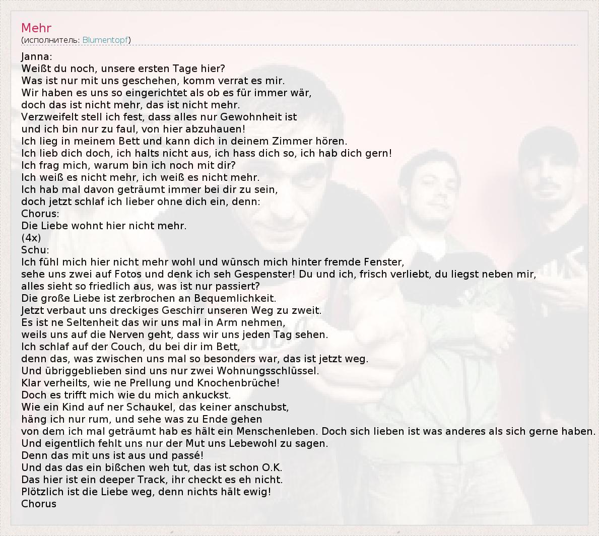 Это интересно:Мюнхен, Германия Blumentopf ("Цветочный горшок") хип-хоп группа из Мюнхена. Их первый альбом “Kein Zufall” (“Не случайно”) вышел в свет в 1997. В 2001 и 2002 гг. читатели журнала “Juice” признали их живые выступления самыми лучшими. Слушатели ценят эту группу за глубокое содержание текстов песен. Однако их популярность и коммерческий успех никогда не достигали уровня других немецких... продолжение