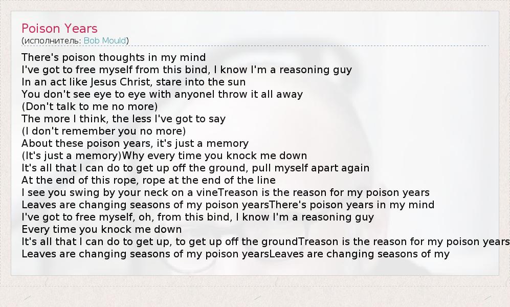 Leaves are changing seasons of my poison yearsThere's poison years in my mind