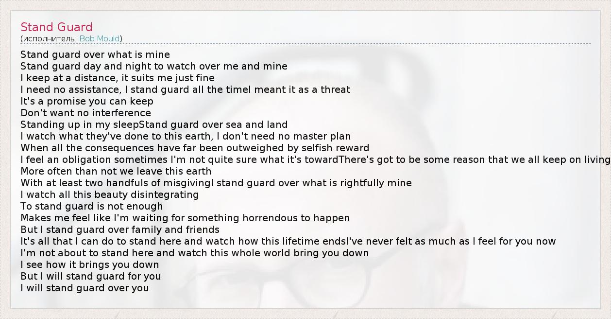 Stand guard over what is mine Stand guard day and night to watch over me and mine I keep at a distance, it suits me just fine I need no assistance, I stand guard all the timeI meant it as a threat It's a promise you can keep Don't want no interference Standing up in my sleepStand guard over sea and land I watch what they've done to this earth, I don't need no master plan When all the consequences have far been outweighed by selfish reward I feel an obligation sometimes I'm not quite sure what it's towardThere's got to be some reason that we all keep on living More often than not we leave this earth With at least two handfuls of misgivingI stand guard over what is rightfully mine I watch all this beauty disintegrating To stand guard is not enough Makes me feel like I'm waiting for something horrendous to happen But I stand guard over family and friends It's all that I can do to stand here and watch how this lifetime endsI've never felt as much as I feel for you now I'm not about to stand here and watch this whole world bring you down I see how it brings you down But I will stand guard for you I will stand guard over you