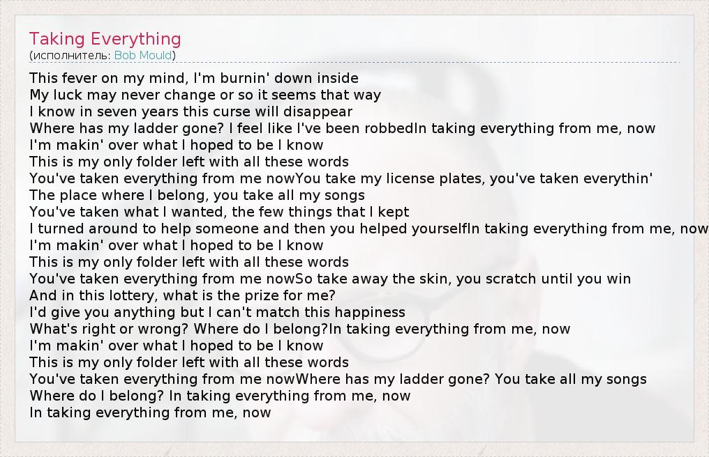 This fever on my mind, I'm burnin' down inside My luck may never change or so it seems that way I know in seven years this curse will disappear Where has my ladder gone? I feel like I've been robbedIn taking everything from me, now I'm makin' over what I hoped to be I know This is my only folder left with all these words You've taken everything from me nowYou take my license plates, you've taken everythin' The place where I belong, you take all my songs You've taken what I wanted, the few things that I kept I turned around to help someone and then you helped yourselfIn taking everything from me, now I'm makin' over what I hoped to be I know This is my only folder left with all these words You've taken everything from me nowSo take away the skin, you scratch until you win And in this lottery, what is the prize for me? I'd give you anything but I can't match this happiness What's right or wrong? Where do I belong?In taking everything from me, now I'm makin' over what I hoped to be I know This is my only folder left with all these words You've taken everything from me nowWhere has my ladder gone? You take all my songs Where do I belong? In taking everything from me, now In taking everything from me, now