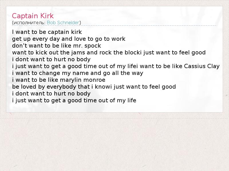 I want to be captain kirk get up every day and love to go to work don't want to be like mr. spock want to kick out the jams and rock the blocki just want to feel good i dont want to hurt no body i just want to get a good time out of my lifei want to be like Cassius Clay i want to change my name and go all the way i want to be like marylin monroe be loved by everybody that i knowi just want to feel good i dont want to hurt no body i just want to get a good time out of my life