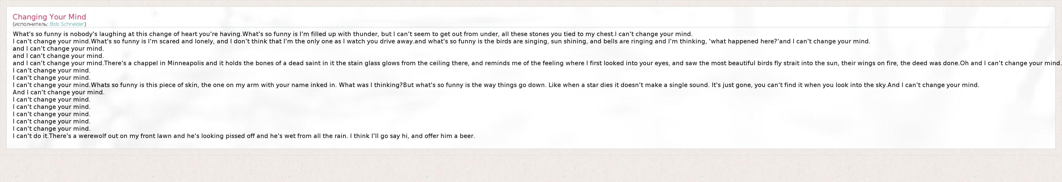 What's so funny is nobody's laughing at this change of heart you're having.What's so funny is I'm filled up with thunder, but I can't seem to get out from under, all these stones you tied to my chest.I can't change your mind. I can't change your mind.What's so funny is I'm scared and lonely, and I don't think that I'm the only one as I watch you drive away.and what's so funny is the birds are singing, sun shining, and bells are ringing and I'm thinking, 'what happened here?'and I can't change your mind. and I can't change your mind. and I can't change your mind. and I can't change your mind.There's a chappel in Minneapolis and it holds the bones of a dead saint in it the stain glass glows from the ceiling there, and reminds me of the feeling where I first looked into your eyes, and saw the most beautiful birds fly strait into the sun, their wings on fire, the deed was done.Oh and I can't change your mind. I can't change your mind. I can't change your mind. I can't change your mind.Whats so funny is this piece of skin, the one on my arm with your name inked in. What was I thinking?But what's so funny is the way things go down. Like when a star dies it doesn't make a single sound. It's just gone, you can't find it when you look into the sky.And I can't change your mind. And I can't change your mind. I can't change your mind. I can't change your mind. I can't change your mind. I can't change your mind. I can't change your mind. I can't do it.There's a werewolf out on my front lawn and he's looking pissed off and he's wet from all the rain. I think I'll go say hi, and offer him a beer.