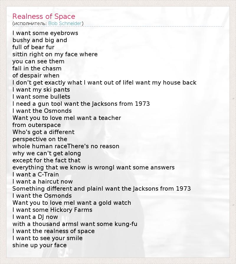 I want some eyebrows bushy and big and full of bear fur sittin right on my face where you can see them fall in the chasm of despair when I don't get exactly what I want out of lifeI want my house back I want my ski pants I want some bullets I need a gun tooI want the Jacksons from 1973 I want the Osmonds Want you to love meI want a teacher from outerspace Who's got a different perspective on the whole human raceThere's no reason why we can't get along except for the fact that everything that we know is wrongI want some answers I want a C-Train I want a haircut now Something different and plainI want the Jacksons from 1973 I want the Osmonds Want you to love meI want a gold watch I want some Hickory Farms I want a DJ now with a thousand armsI want some kung-fu I want the realness of space I want to see your smile shine up your face
