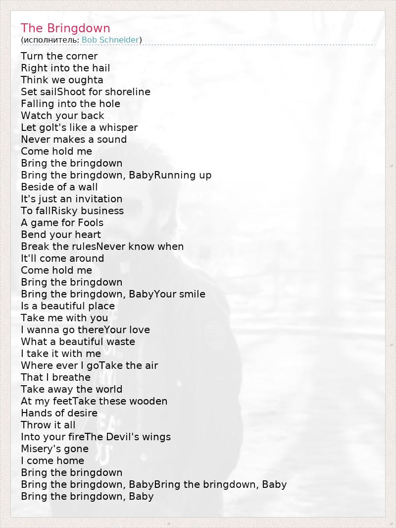 Turn the corner Right into the hail Think we oughta Set sailShoot for shoreline Falling into the hole Watch your back Let goIt's like a whisper Never makes a sound Come hold me Bring the bringdown Bring the bringdown, BabyRunning up Beside of a wall It's just an invitation To fallRisky business A game for Fools Bend your heart Break the rulesNever know when It'll come around Come hold me Bring the bringdown Bring the bringdown, BabyYour smile Is a beautiful place Take me with you I wanna go thereYour love What a beautiful waste I take it with me Where ever I goTake the air That I breathe Take away the world At my feetTake these wooden Hands of desire Throw it all Into your fireThe Devil's wings Misery's gone I come home Bring the bringdown Bring the bringdown, BabyBring the bringdown, Baby Bring the bringdown, Baby