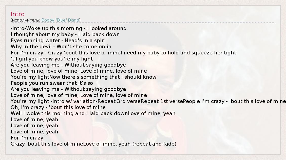 Это интересно:Бобби Блэнд родился в маленьком городе под названием Розмарк, штат Теннесси, США. Позднее вместе с матерью переехал в Мемфис, где впервые стал петь с местными группами, исполняющими госпел. Стремительно расширяя горизонт своих интересов, он начал все чаще появляться на знаменитой улице Мемфиса «Бил Стрит» (Beale Street). Там он знакомится с узким кругом увлеченных музыкантов, оправданно называющих... продолжение