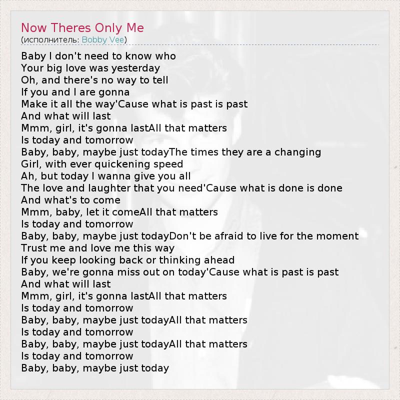Baby I don't need to know who Your big love was yesterday Oh, and there's no way to tell If you and I are gonna Make it all the way'Cause what is past is past And what will last Mmm, girl, it's gonna lastAll that matters Is today and tomorrow Baby, baby, maybe just todayThe times they are a changing Girl, with ever quickening speed Ah, but today I wanna give you all The love and laughter that you need'Cause what is done is done And what's to come Mmm, baby, let it comeAll that matters Is today and tomorrow Baby, baby, maybe just todayDon't be afraid to live for the moment Trust me and love me this way If you keep looking back or thinking ahead Baby, we're gonna miss out on today'Cause what is past is past And what will last Mmm, girl, it's gonna lastAll that matters Is today and tomorrow Baby, baby, maybe just todayAll that matters Is today and tomorrow Baby, baby, maybe just todayAll that matters Is today and tomorrow Baby, baby, maybe just today